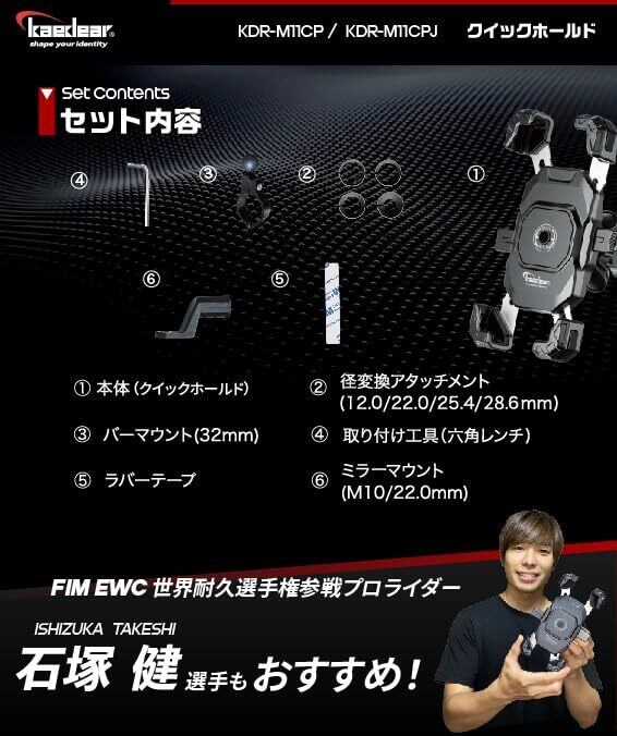 【商品仕様】 ■ホルダーサイズ:縦幅140~177mm、横幅62~94mm、厚さ15mm ■材質:アルミニウム合金(マウント)+ポリカーボネート+ABS ■セット内容:本体+Airアブソーバー(17mmボール)、バーマウント(17mmボール/32mm/幅15mm)、ミラーマウント(クランプ22mm/M10/厚7mm)、径変換アタッチメント(12/22/25.4/28.6mm)、2mmラバーテープ、六角レンチ■取扱説明書(オンラインのみ):環境負荷の軽減を目指した脱炭素化への取り組みとして、紙媒体での同封を控えさせていただいております。Kaedear公式サイトの各商品ページから閲覧またはダウンロードが可能です。 ■ブランド:Kaedear(カエディア) ■万一に備え、セーフティーストラップKDR-SFB-S、カラビナなどを活用し、ホルダーセット後にハンドルと繋げる事で不測の事態に備える事をおすすめしています。