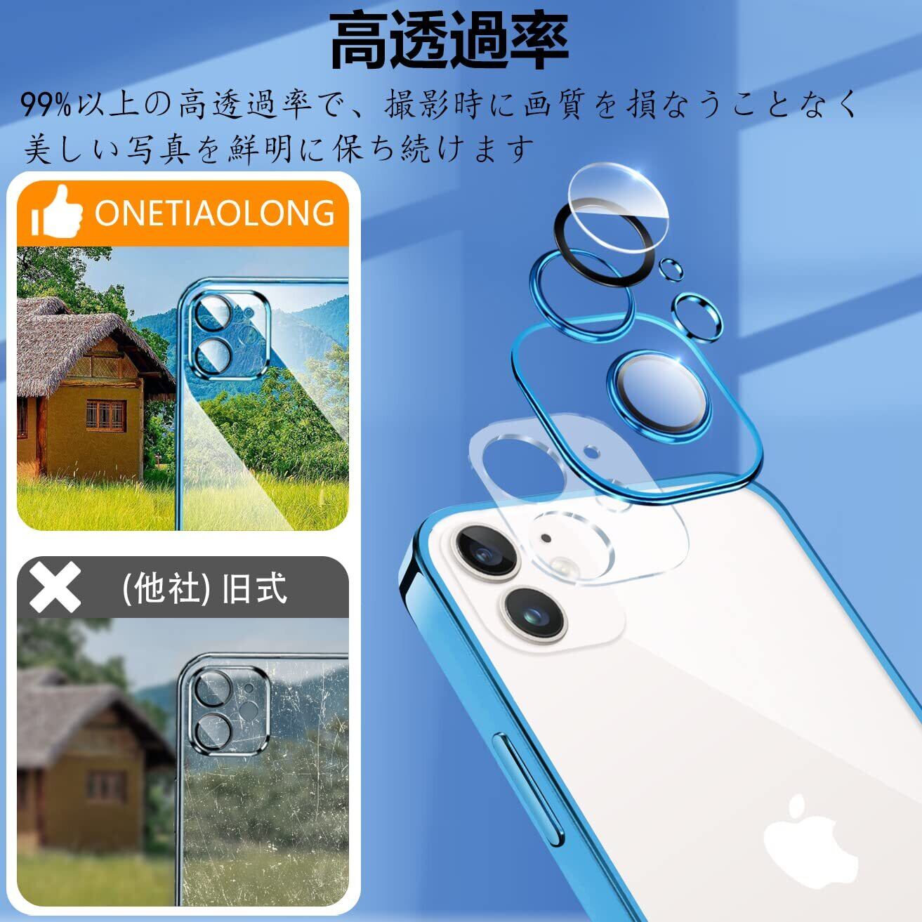 IPhone12 Mini ケース クリア アイフォン12Mini レンズ保護 カバー 耐衝撃 透明 スマホケース 全面保護 軽量 メッキ加工 TPU 薄型 ストラップホール付き 滑り止め 落下防止 5.4インチ(ブルー)
