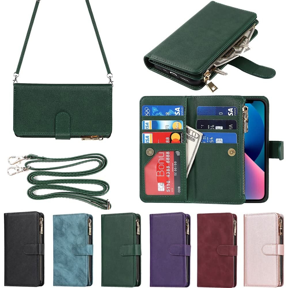 アイフォンiPhone 13 Mini ケース for iPhone 13mini 縄掛けケース 手帳型 財布型 ICカード コインポケット ストラップ付き カード 収納 小銭入れ ファスナーポケット付き PUレザー 6色 グリーン