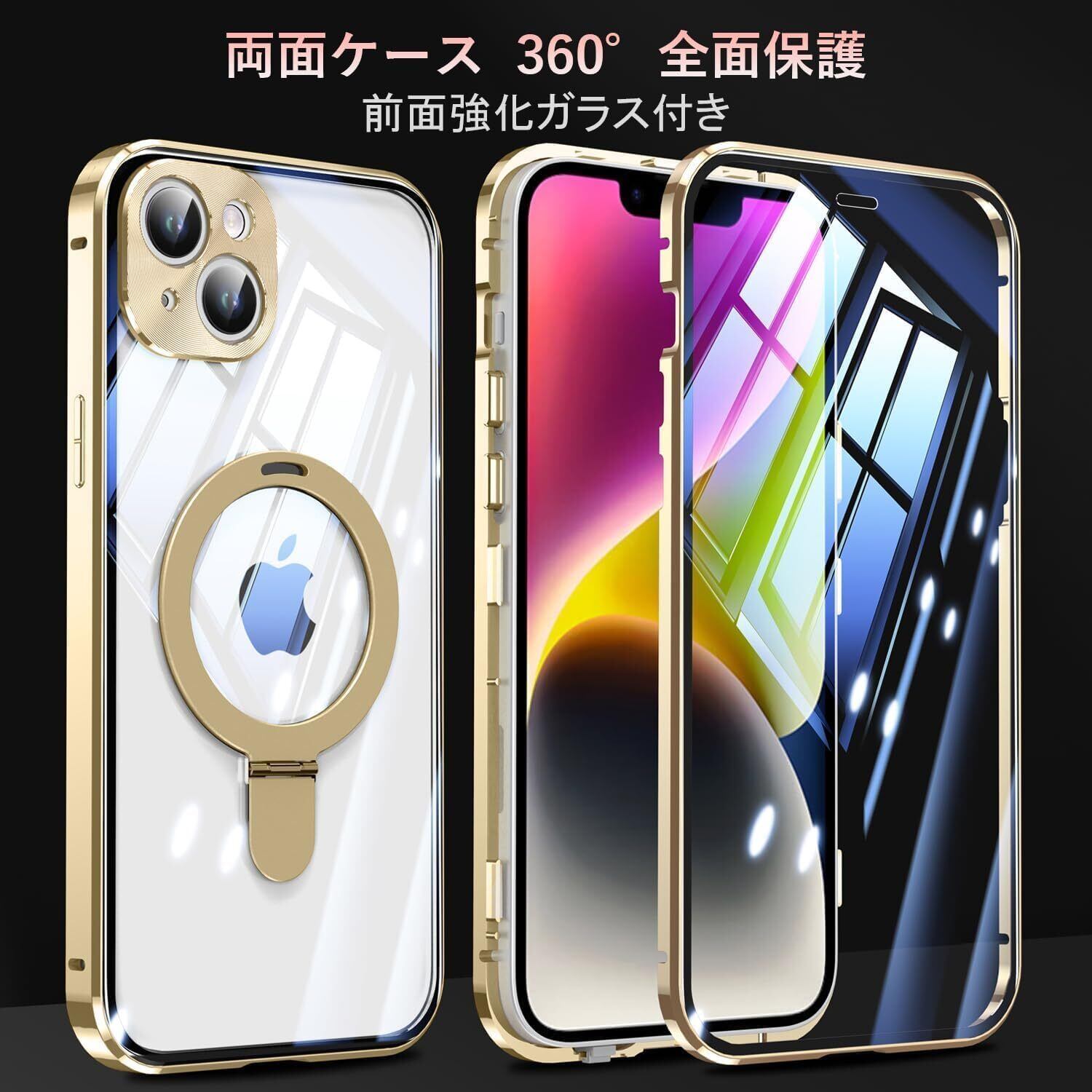 OURJOY iPhone 15 Plus 用 ケース 【両面保護+MagSafe対応+ロック式+多機能一体スタンド】 ガラスケース クリア 360°全面保護 アイフォン15 プラス スマホケース アルミバンパー フルカバー カメラレンズ保護 ワイヤレス充電 携帯ケース・ゴールド
