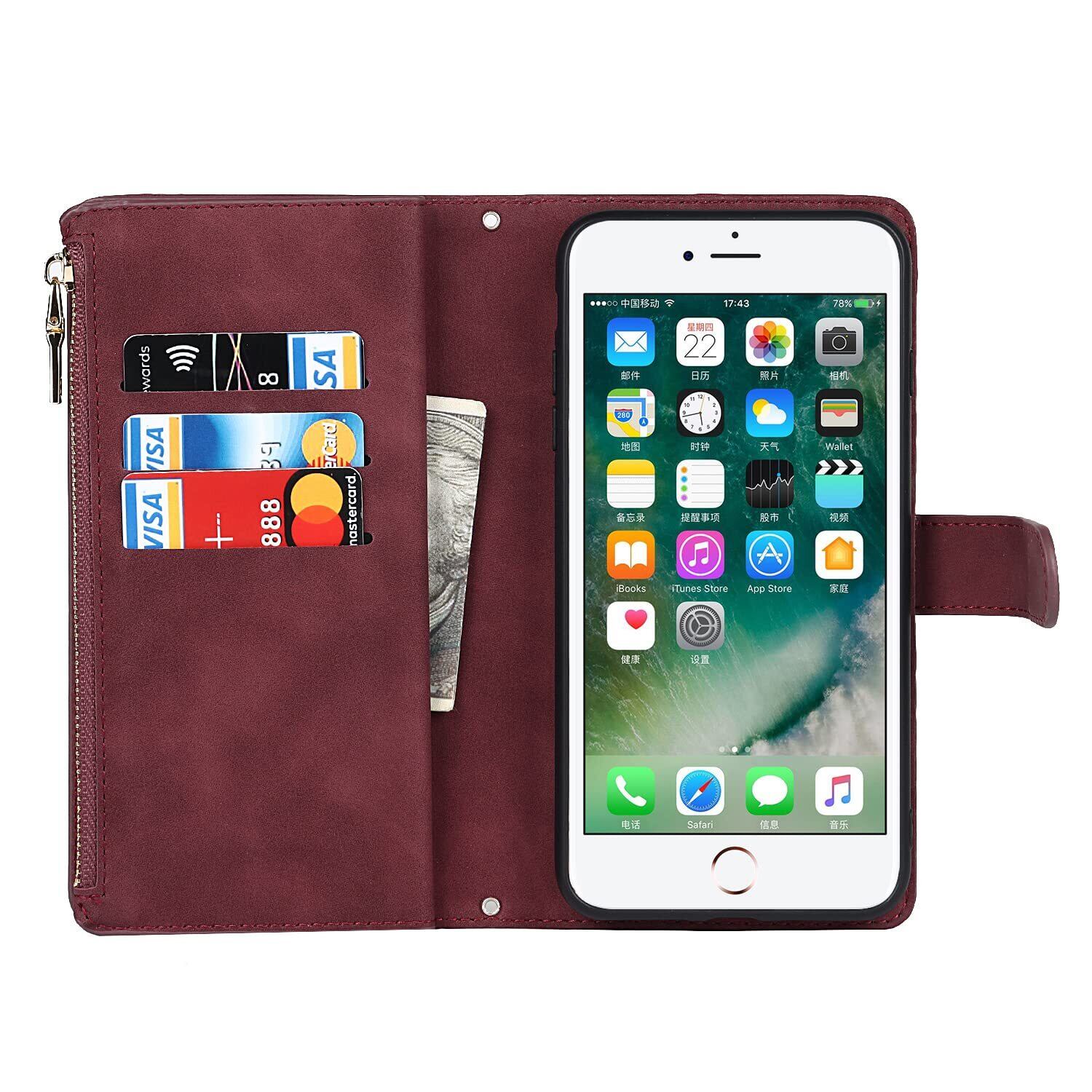 Eastwave アイフォン 7 Plus / 8 Plus ケース for iPhone 7plus / 8plus 縄掛けケース 手帳型 財布型 ICカード コインポケット ストラップ付き カード 収納 小銭入れ ファスナーポケット付き PUレザー 6色 レッド