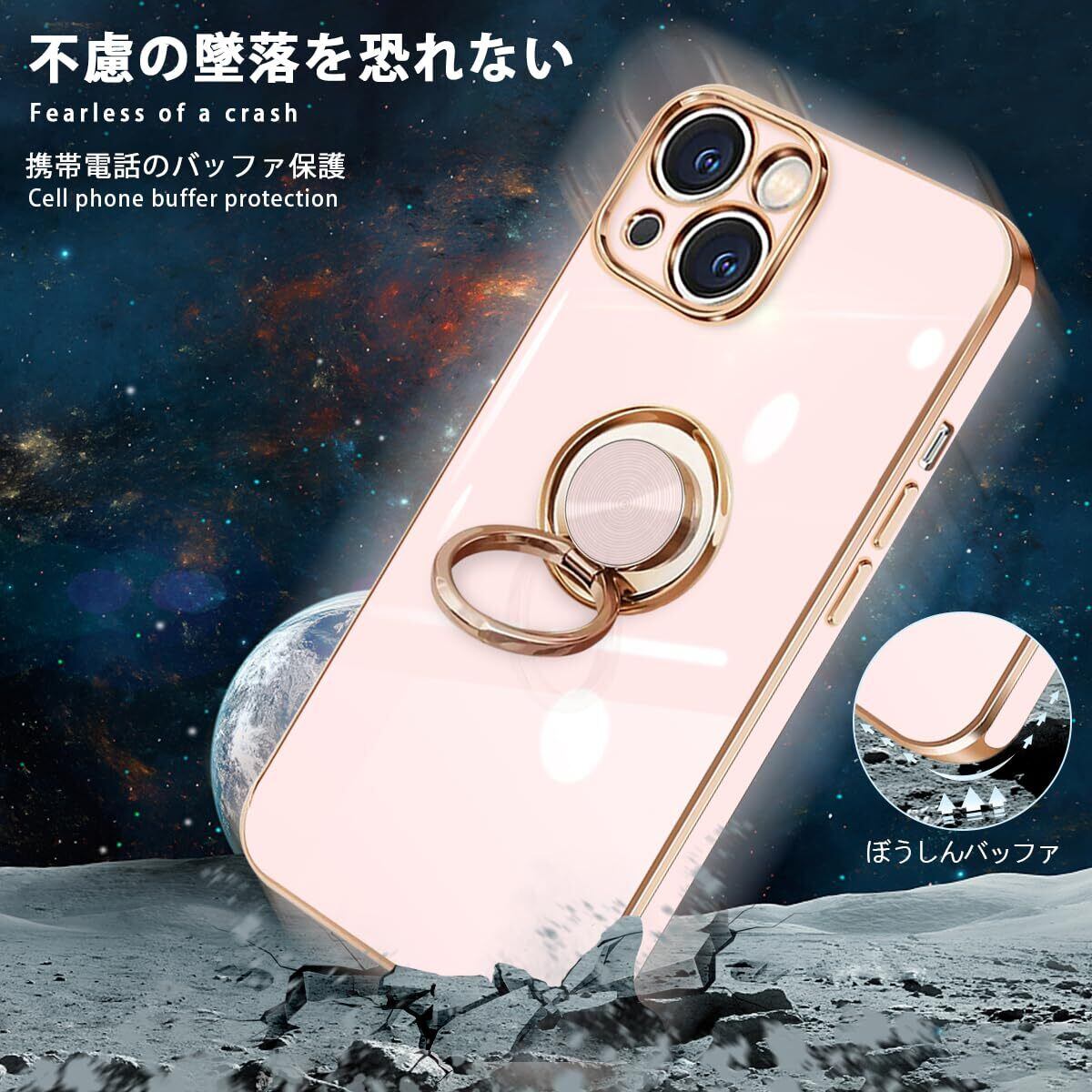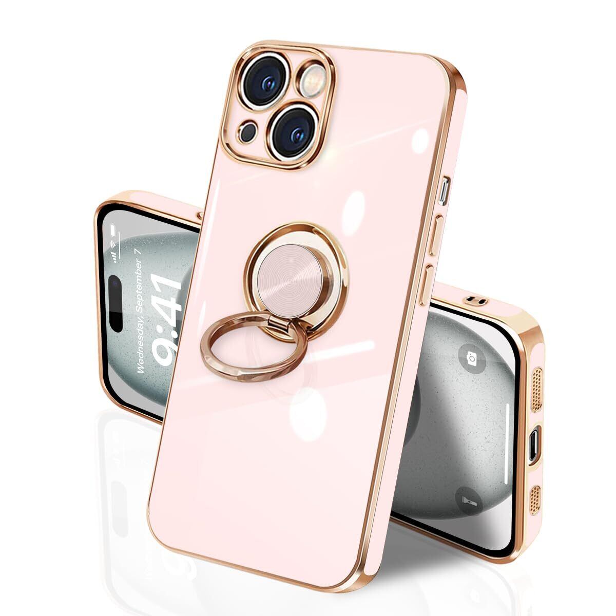 iPhone 15 ケース リング付き イフォン15 リング TPU カバー 全面保護 耐衝撃 スマホケース iPhone 15 360°回転 スタンド機能 携帯カバー 車載ホルダー対応 ストラップホール付き メッキ加工 擦り傷防止 6.1インチ(ピンク)
