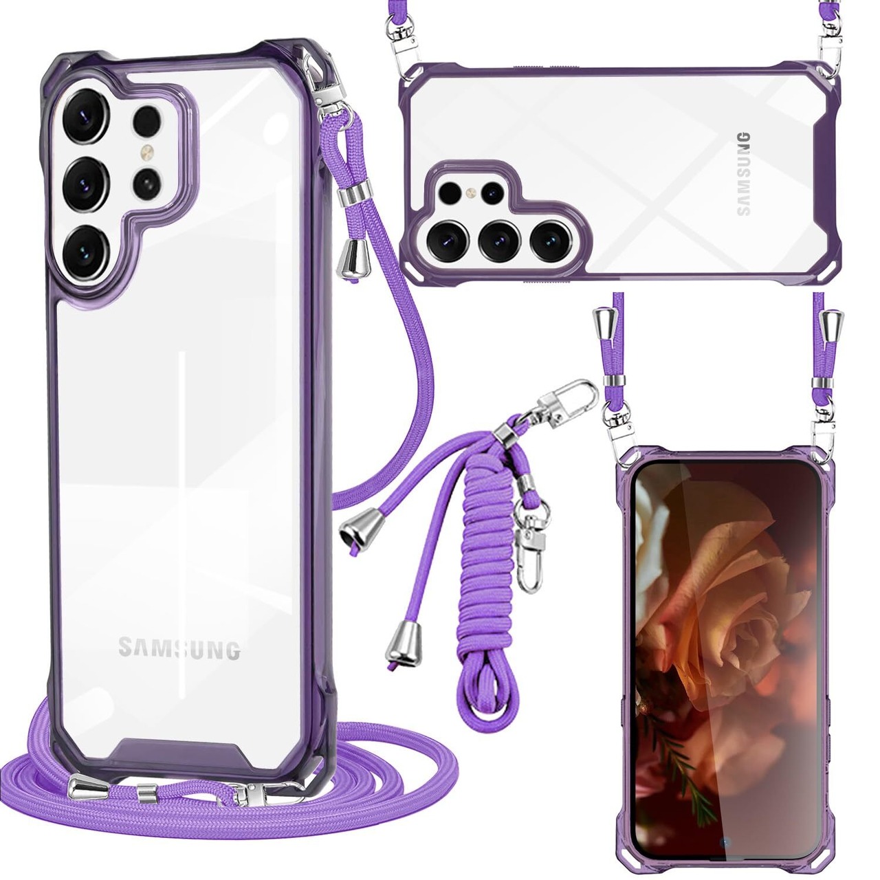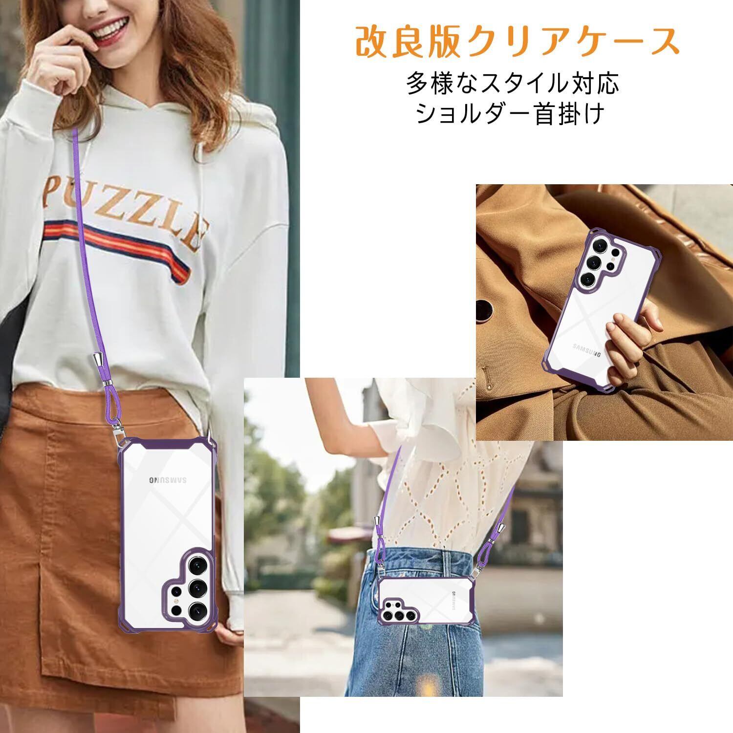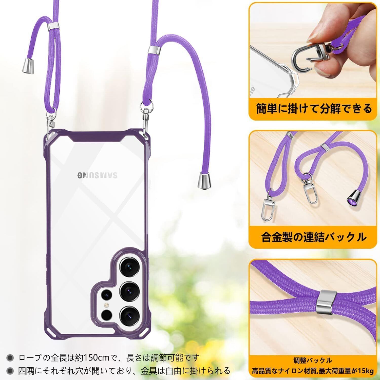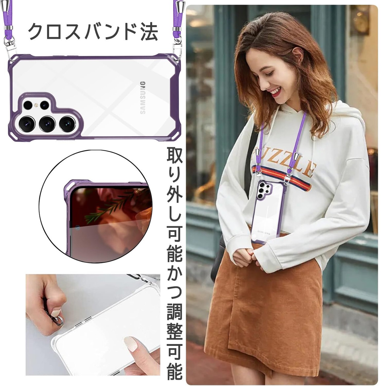 Galaxy S24 Ultra ケース クリア PC ショルダー 軽量 耐衝撃 カバー ギャラクシーS24Ultra SC-52E | SCG26 ケース 透明 薄型 軽量 PC背面 + TPUバンパー 二層構造 携帯ケース 首掛け 肩掛け 斜めかけ 縄掛けケース ストラップ付き 1.5M 取り外し可能 縦/横 2WAY 調節可能な 全面保護 落下防止 衝撃吸収 ワイヤレス充電対応 (パープル)