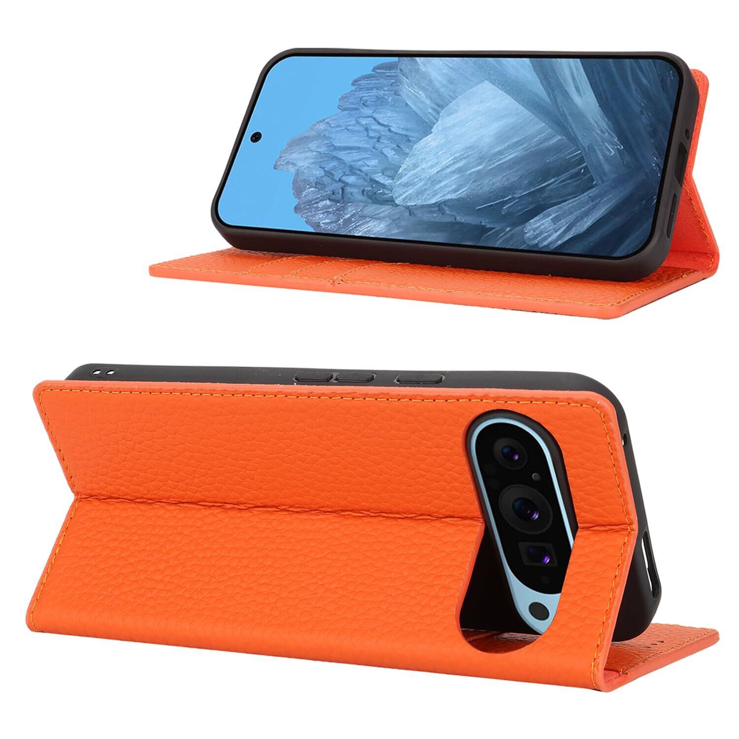for Google Pixel 9Pro XL ケース 本革 牛革 for pixel 9ProXL ケース for pixel9proxl手帳型 カバー Case カバー 手帳 本革 柔らかい 本皮 スプラットホール付き スプラット同梱 内蔵マグネット オレンジ