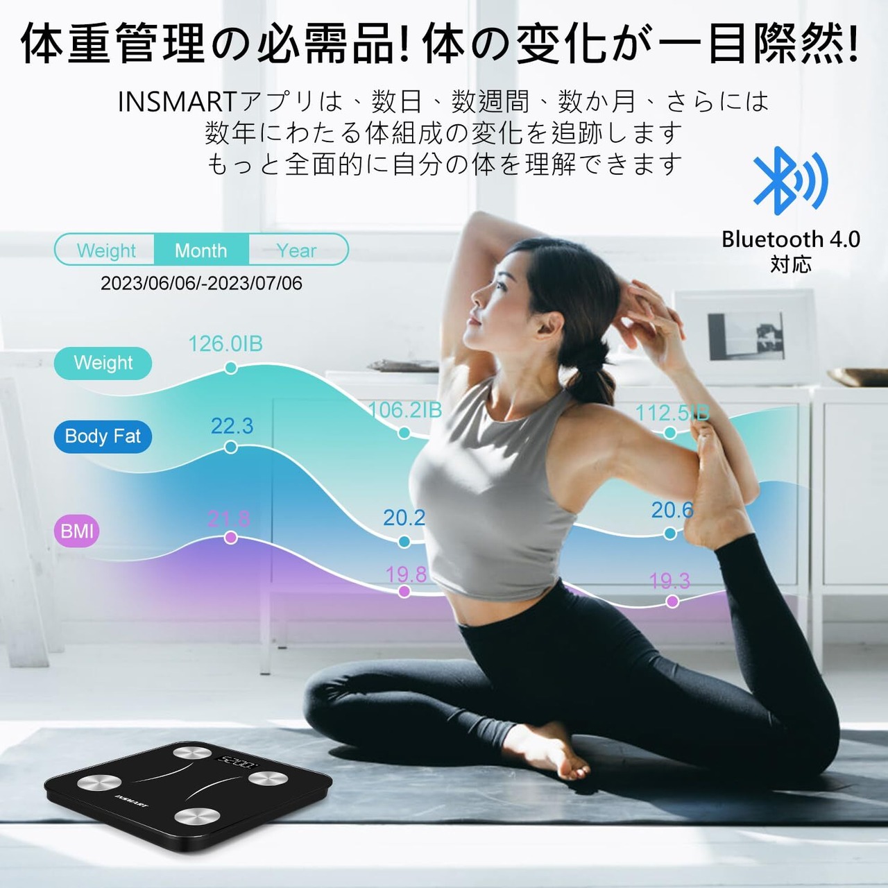 【専用アプリ「Insmart Health」&データ同期体組成計】スマホ連動*データ同期、Bluetooth経由で体組成計をスマホと連携して、測定データがアプリへ自動転送&記録され、充実な測定データ、体測定値の変動傾向により、体調管理やダイエットにも最適な体組成計です!App store、Google Playから無料専用アプリ「Insmart Health」インストールできます。