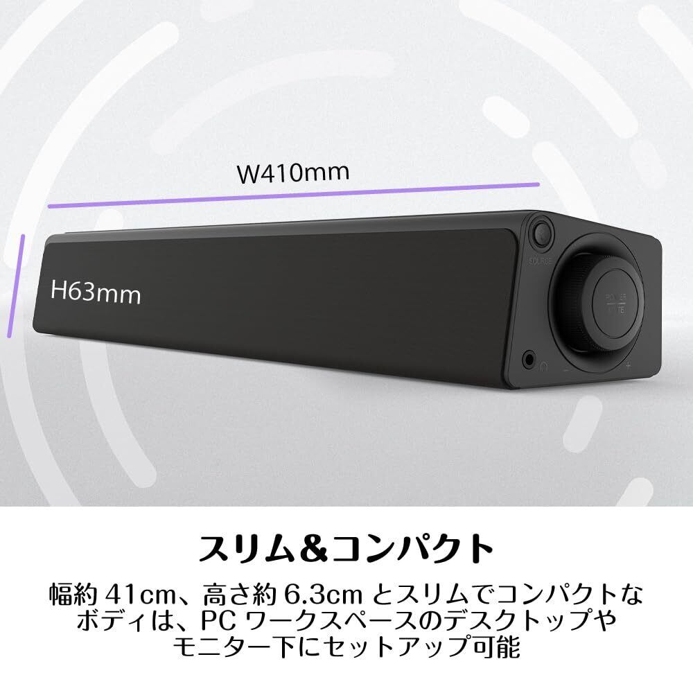 【簡単操作と入力ソース、パンチの効いたサウンド】サウンドバーの正面右側面に操作しやすい大型の音量ノブや、ソースの切り替えやBluetoothペアリングに使えるボタンを配置。PCとの接続はドライバーのインストールが不要でUSB-C ケーブル1本で接続。パンチの効いた低音を実現するカスタム チューンを施したネオジウム ドライバーを搭載、USB-C接続(5V/3A)で最大12W RMS/ピーク出力24Wのパワフル オーディオを再生。【ご注意】1.接続機器の電源オフや操作によっては電源変動に伴うノイズが聞こえる場合がありますが故障ではありません。2.お手持ちのヘッドホン/イヤホンを接続可能な出力端子も搭載しますが、ヘッドセットのマイクはご使用できません。