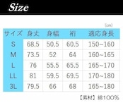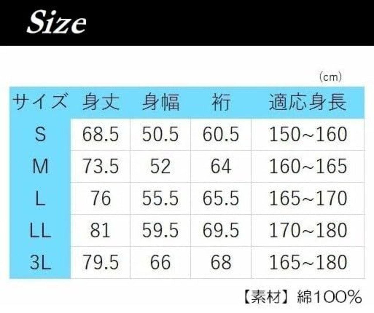 S:身長150-160cm・身丈68.5㎝・身巾50.5㎝/ M:身長160-165㎝・身丈73.5㎝・身巾52㎝/ L:身長165-170㎝・身丈76㎝・身巾55.5㎝/ LL:身長170-180㎝・身丈81㎝・身巾59.5㎝/ 3L:身長165-180㎝・身丈79.5㎝・身巾66㎝/