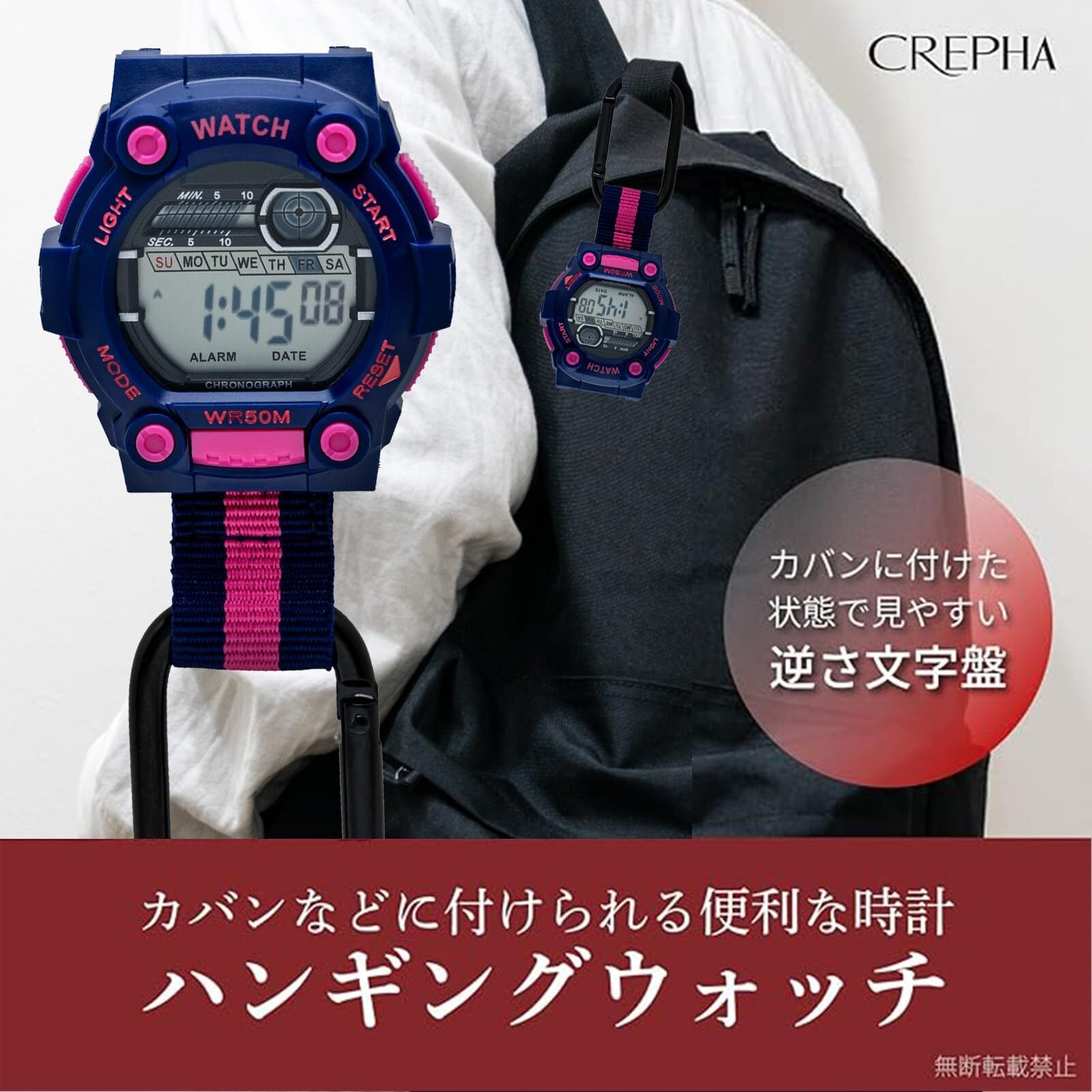 [クレファー] 懐中時計 デジタル メンズ 防水 カラビナ キーホルダー ネイビー ピンク WKM-100-04