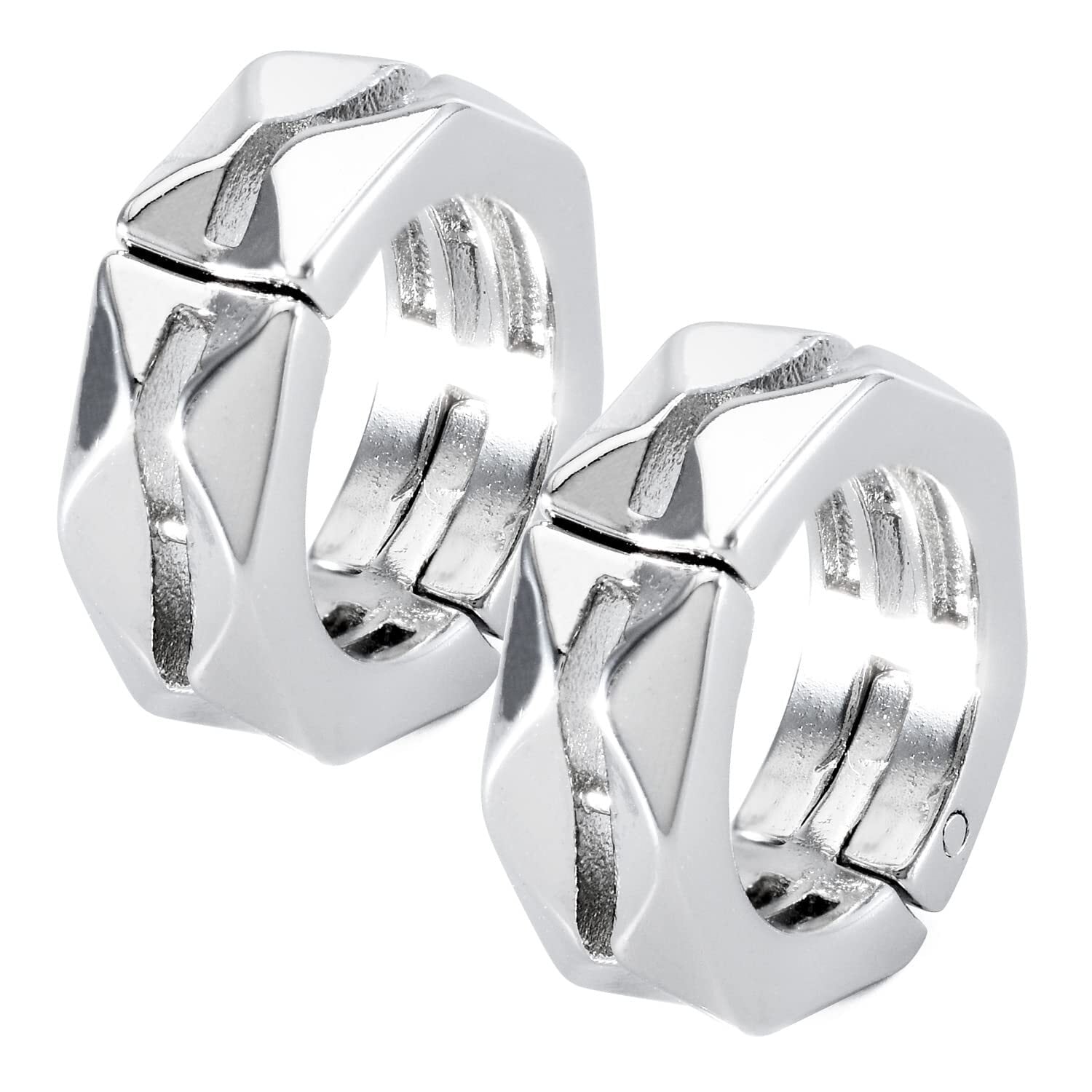 【 おしゃれなデザイン 】中央に溝を入れどの角度から見てもキラキラと高級感のある輝きを放つダイヤカット、シンプルなフェイクピアスに飽きてしまった方や周りと差をつけたい方におすすめのアクセサリーです。ダイヤカットフェイクピアスはメンズだけではなく、レディースにもお使いいただけます。光の反射により輝きを放ち、エッジを効かせたデザインがあなたの耳元をおしゃれに演出します。耳に直接触れる部分は耳への負担が少なく外れにくい平らなフラット加工をしております。フープイヤリングのサイズは外径15mm 内径10mmフープイヤリングの厚さは約5mm 重さは約2グラムになります。カラーはシルバー ブラックからお選びください。