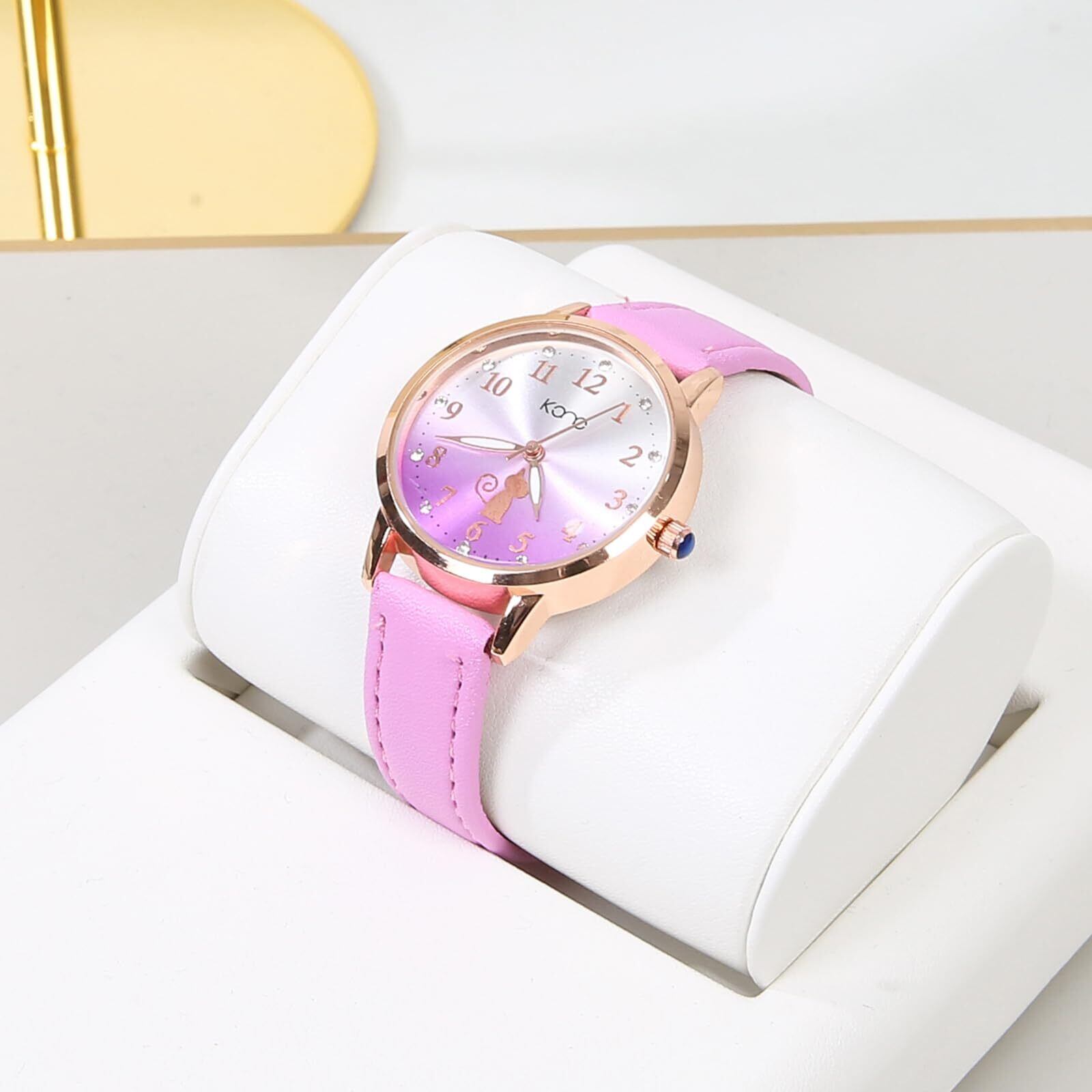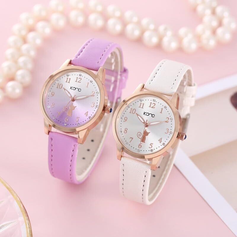 キッズ腕時計 クオーツ アナログ表示 ガールズ子供用腕時計 猫柄 可愛い 猫時計 子供の日 入学 通学 入園 通園 新学期 誕生日 お祝い プレゼント (パープル)