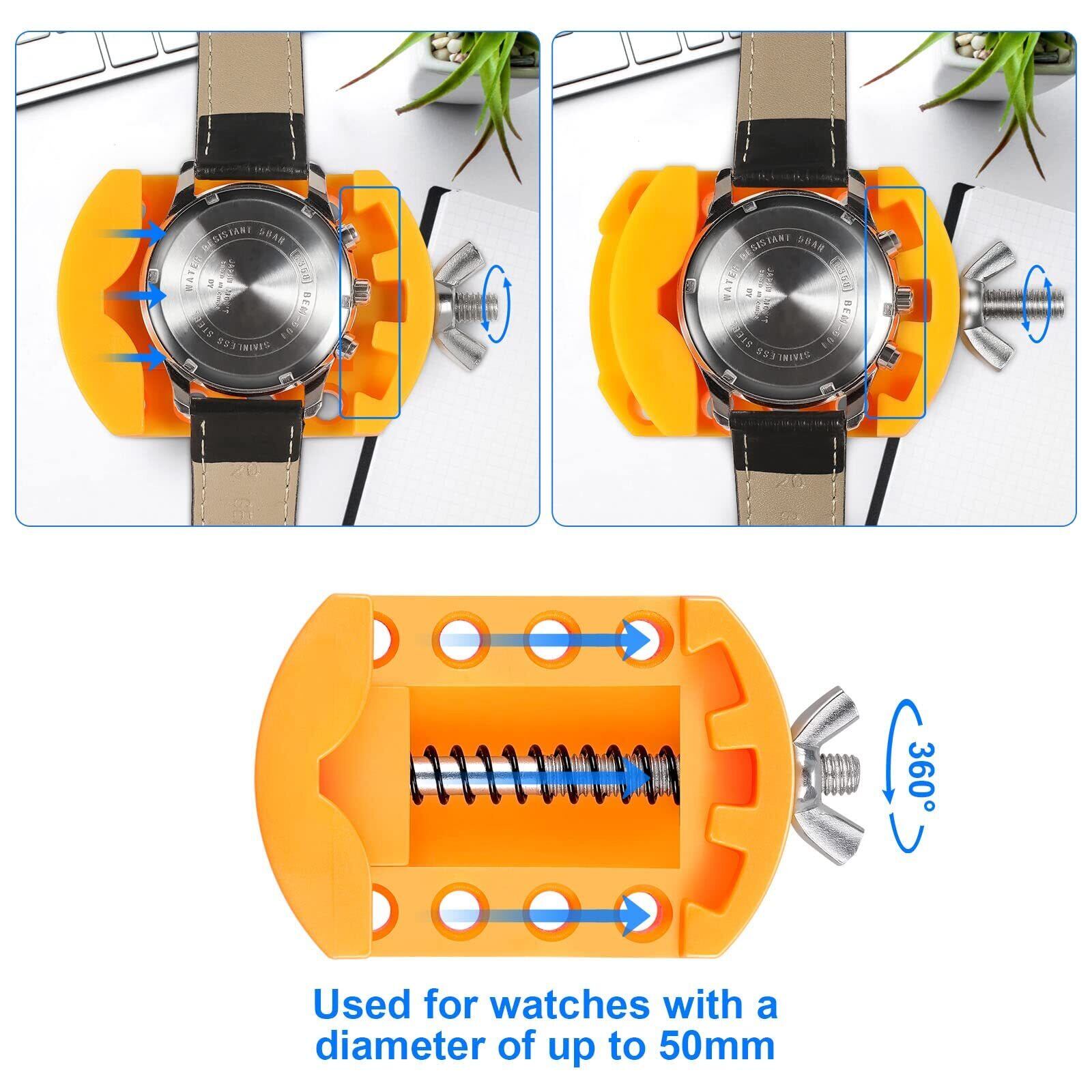 【JOREST】腕時計 電池交換 工具、時計 裏蓋オープナーを回転させると時計カバーが開きます、腕時計 裏蓋外し、ウォッチオープナー、時計固定ホルダー、ピンセット、取扱説明書(英語版)