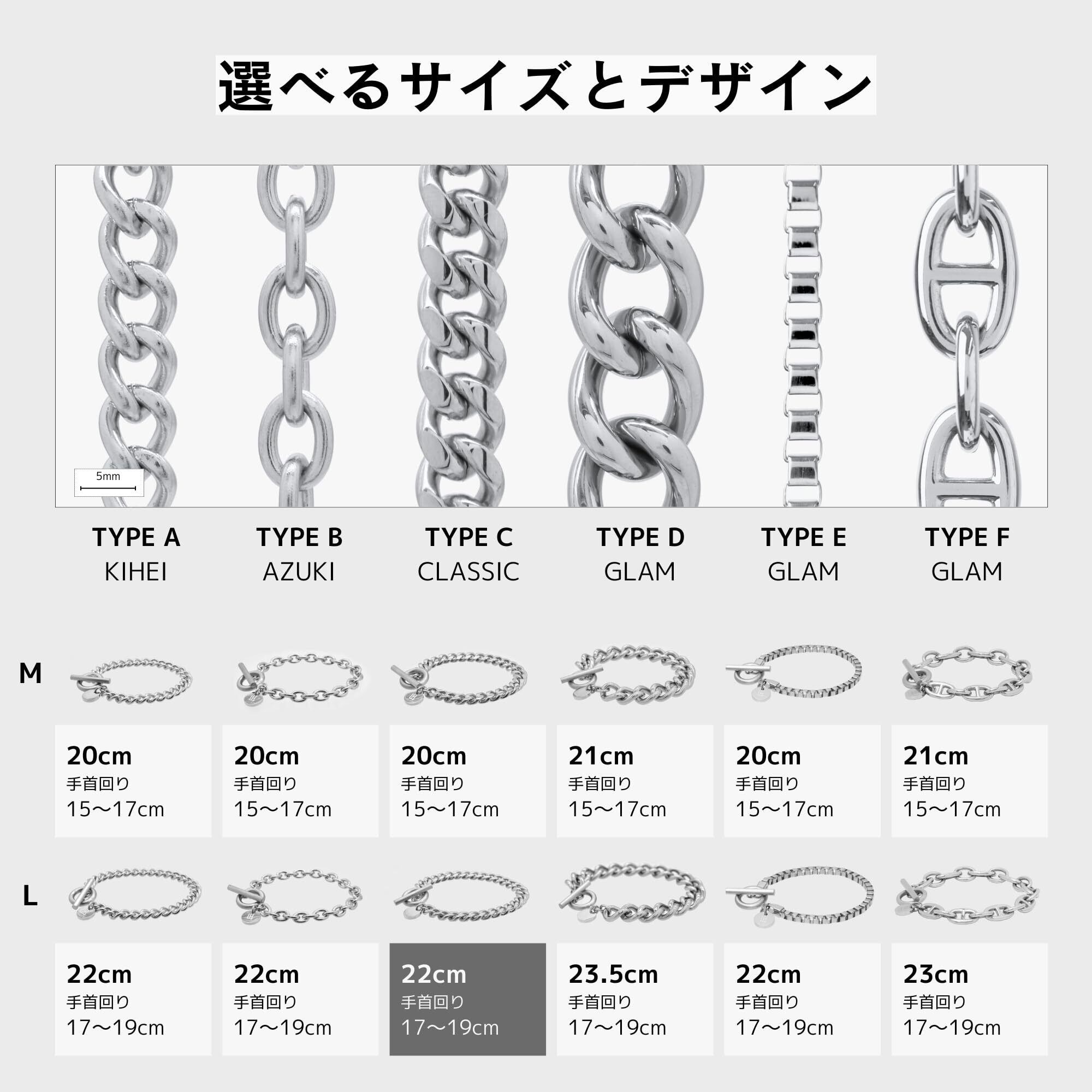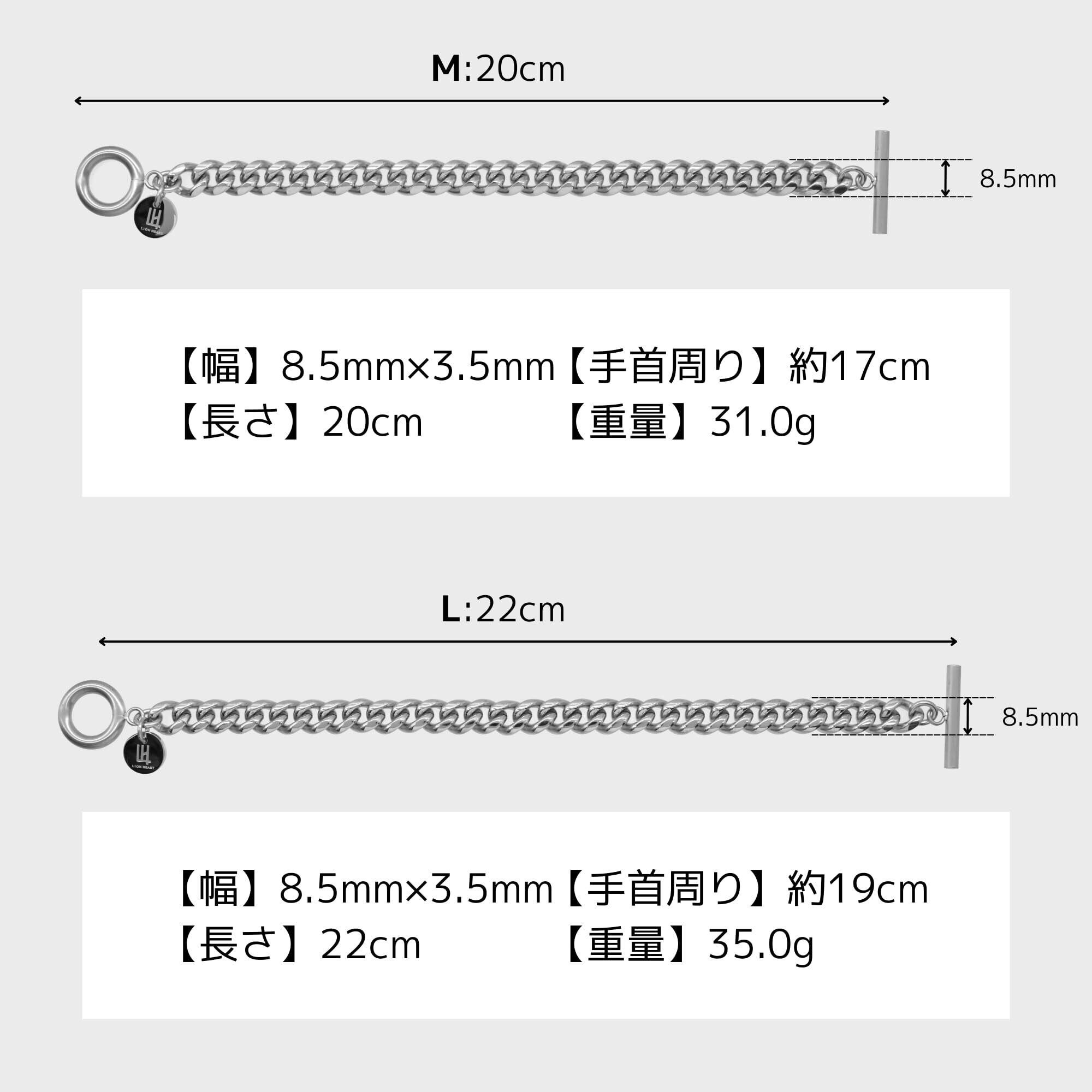 【ボリュームのあるサイズ感】「手首周り」19cm前後「チェーン全長」22cm「幅」0.85cm「厚み」0.35cm/太めで存在感のあるチェーンを使用したチェーンブレスレット。