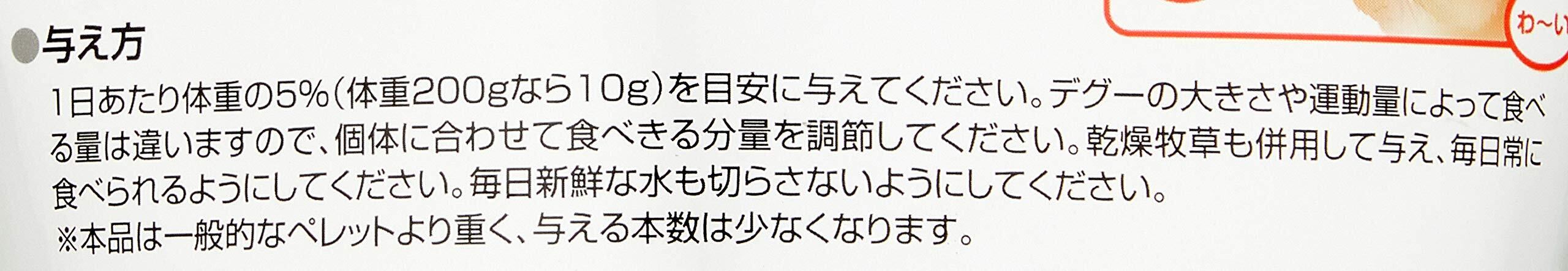 1日あたり体重の5%(体重200gなら10g)を目安に与えてください。デグーの大きさや運動量によって食べる量は違いますので、個体に合わせて食べきる分量を調節してください。乾燥牧草も併用し、毎日常に食べきれる量を同時に与えるとよいでしょう。