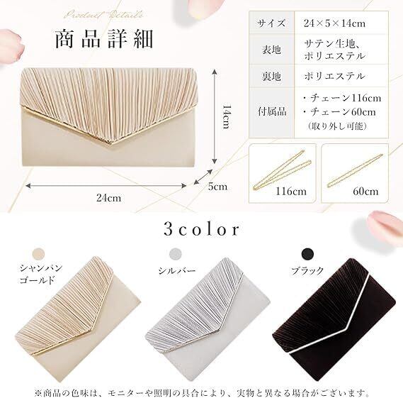 ️【商品情報】結婚式 バッグ 容量 14 × 5 × 14cm 表地:サテン生地、ポリエステル 裏地:ポリエステル 【カラー】シャンパンゴールド、シルバー、ブラック 【付属品】チェーン 116cm(取り外し可能)※商品の色味は、モニターや照明の具合により、実物と異なる場合がございます。