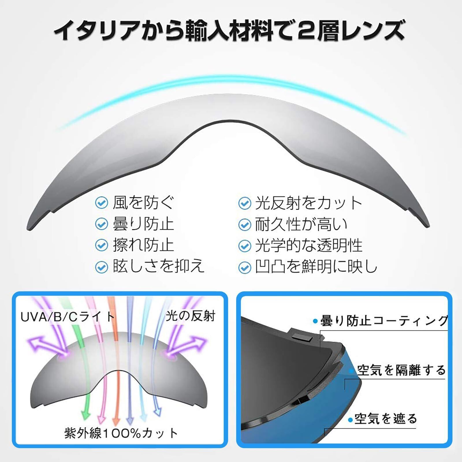 【100% UV400保護と曇り止め】 UV 100% カットと強力な曇り止め効果を発揮します。 常に視界をクリアに保ち、目を完全に保護してください。