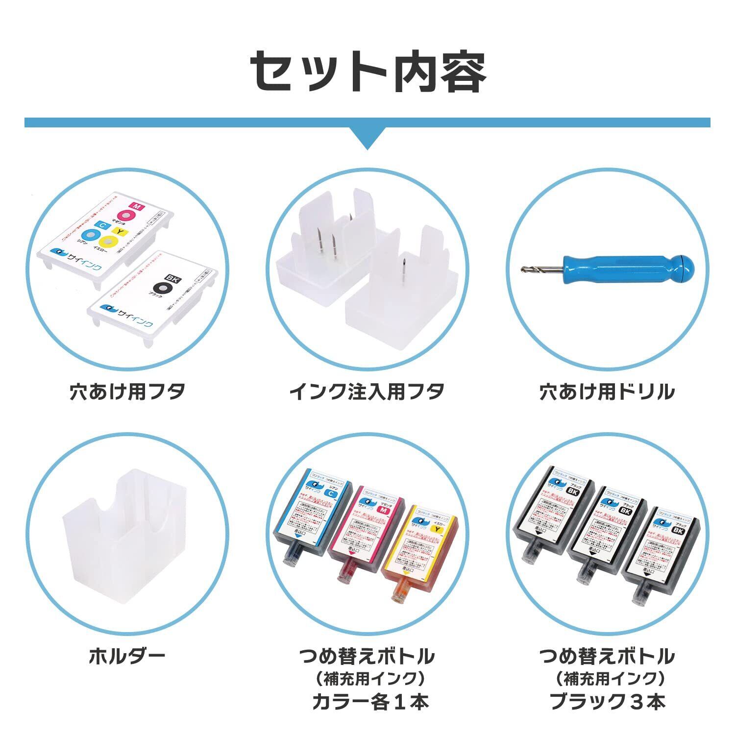 [商品説明] ・使い切った純正インクカートリッジにインクを再充填して再利用する製品です。メーカー純正品ではありません。・一度使用したカートリッジを再利用するため、インク残量は表示されません。つめ替え作業後にプリンターの残量検出機能の無効化作業が必要です。・インク交換のタイミングは印刷がかすれてきたら行ってください。・セット内容:つめ替えボトル(補充用インク)・ホルダー・穴あけ用フタ・インク注入用フタ・ドリル・取扱説明書 ※使用済みカートリッジは付属していません。・工場と共同開発!付属商品と使用済みカートリッジがあれば簡単にインクのつめ替えが可能です。・キットは付属の補充用インク使用後も繰り返し使用することが可能です。※作業は、古新聞などの汚れてもよいものの上で行ってください。