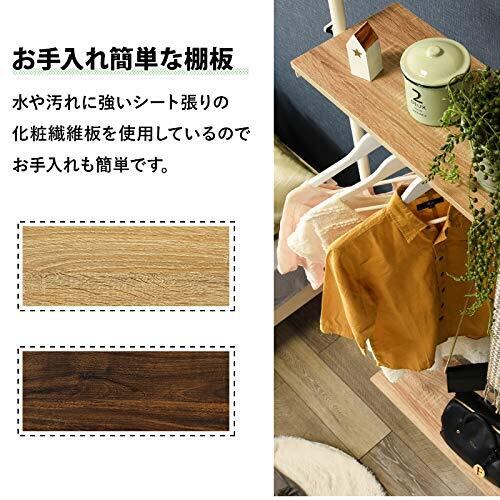 好きな場所で好きな高さに服を収納できる、木目調の棚付きつっぱりハンガーラック。