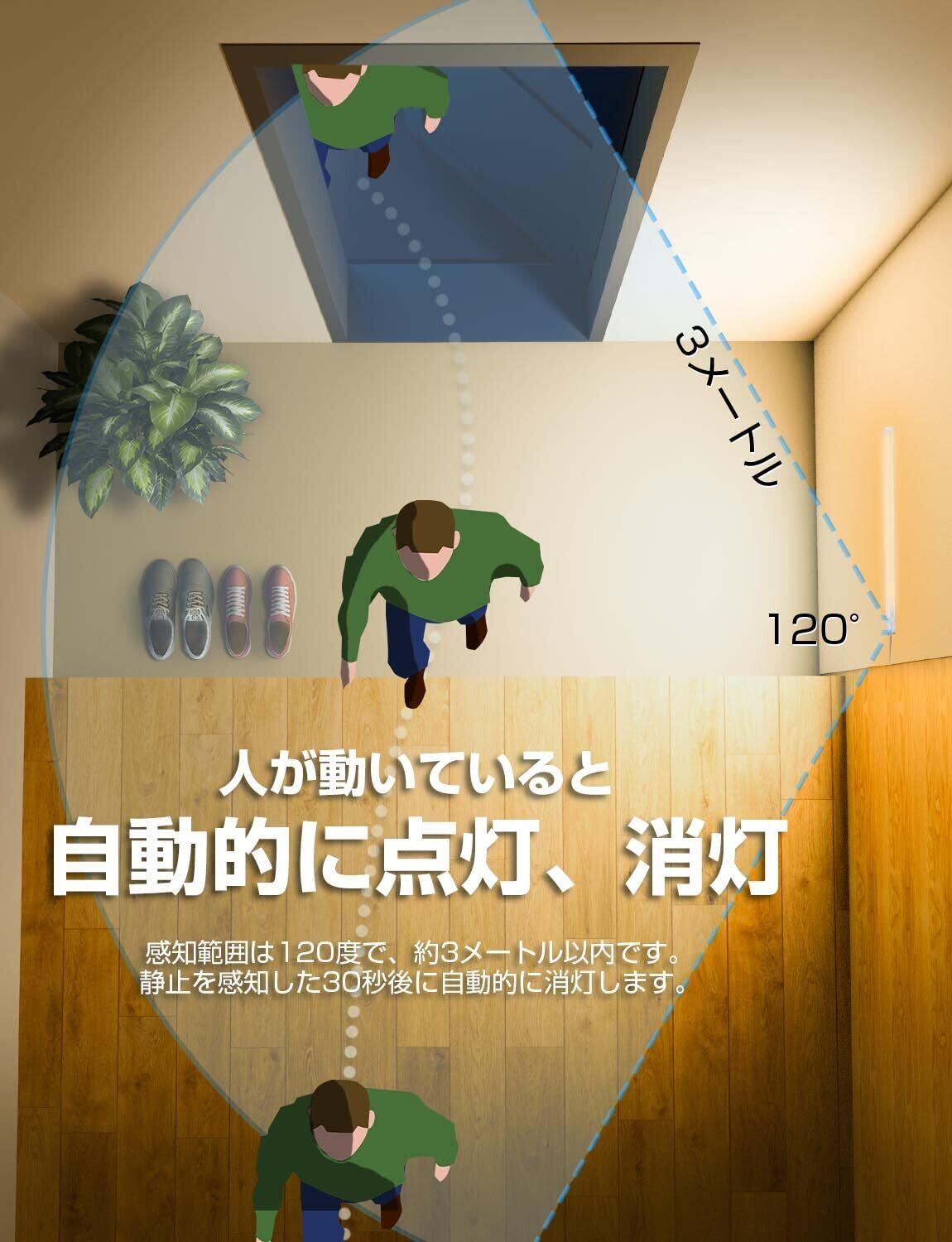 【自動点灯・自動消灯】人感センサー搭載して、120度以内で3メートル以内の動体検知してライトが点灯し、約30秒後に動体が検知されない場合は自動に消灯します。