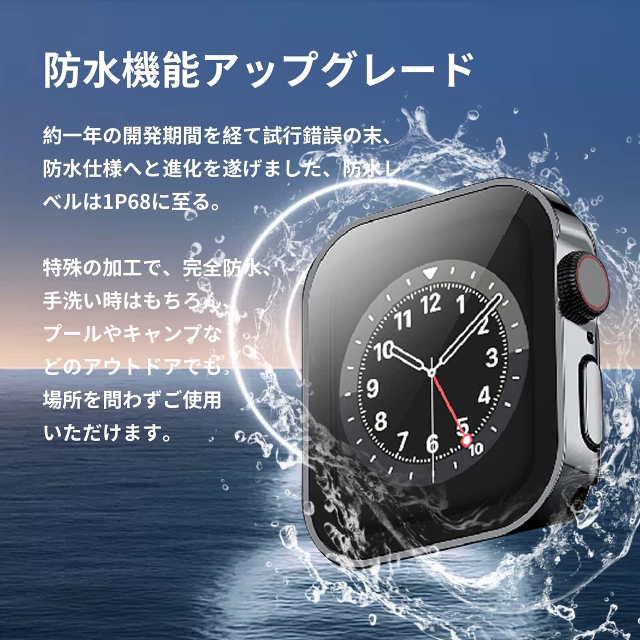 【日常生活防水全面保護・耐衝撃】アップルウォッチ本体にはめ込むだけで、手軽に装着できます。Apple Watchケース特殊加工による防水機能により、 手を洗う時はもちろん汗をかいた時、シャワーを浴びた時にもかかわらずにアップルウォッチをご使用できます。液晶面全体を保護する安心の構造で、普段使い程度の衝撃では、本体に傷がつくことはほとんどありません。