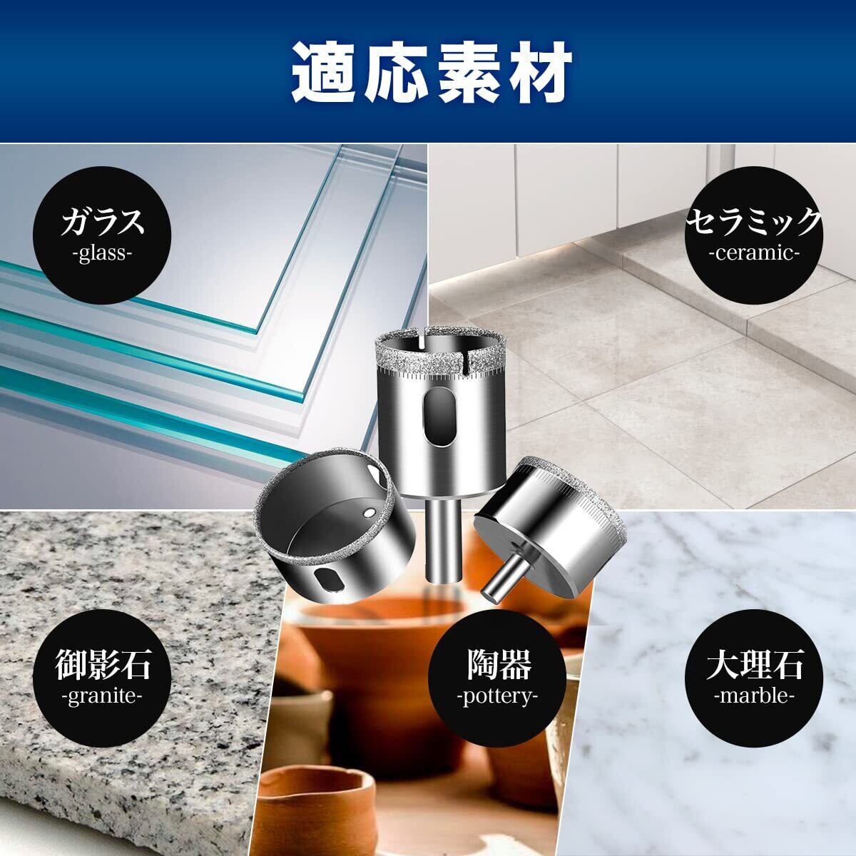 電気ドリル、充電式ドリルドライバー 、ボール盤にとりつけて、ガラス、タイルはもちろん、大理石、花崗岩などの穴開けにも対応可能。