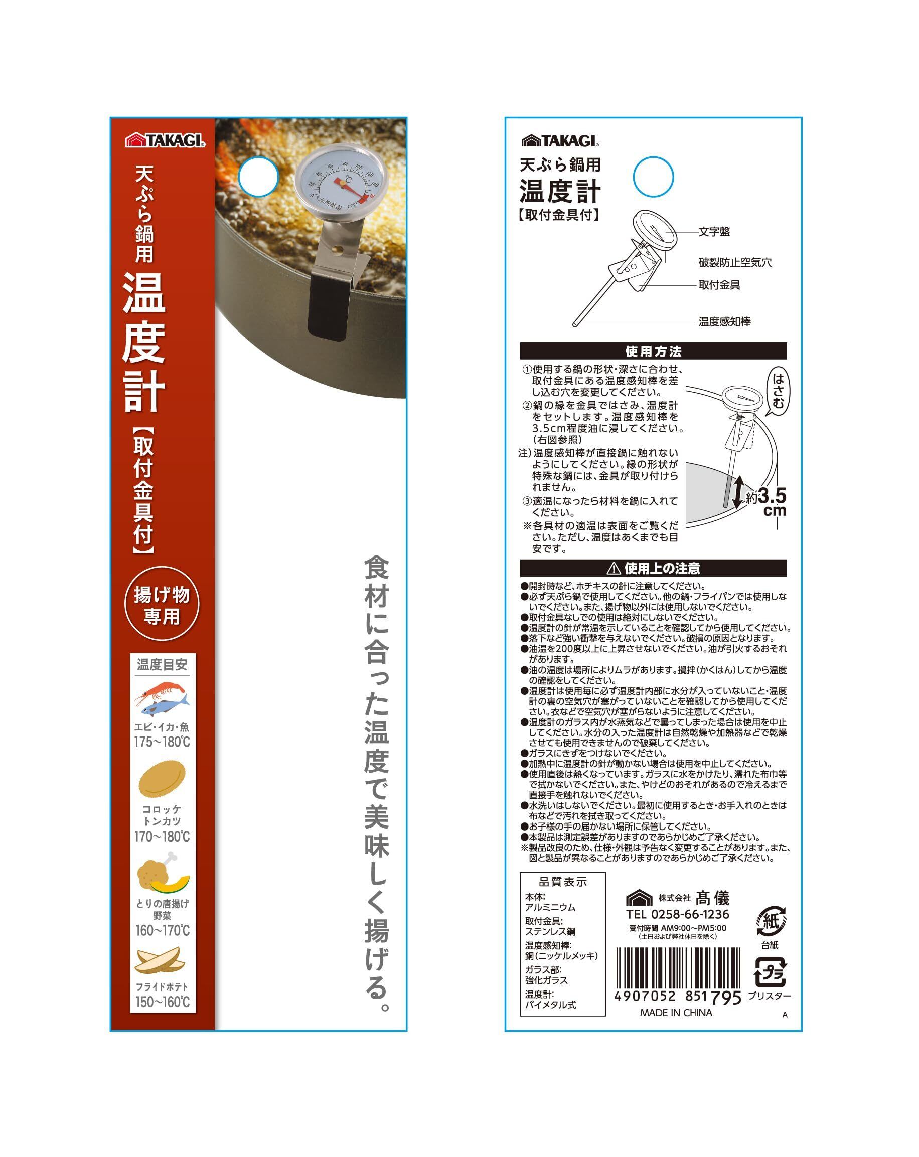 髙儀(Takagi) TAKAGI 天ぷら鍋用温度計 アナログ 取付金具付 揚げ物専用 食材に合わせた温度で美味しく揚げる 揚げ物料理 天ぷら 唐揚げ 食用油 揚げ油 温度管理 適温チェック バイメタル式 油温度測定用品 キッチングッズ キッチンアイテム 調理器具 調理小物 高儀 たかぎ