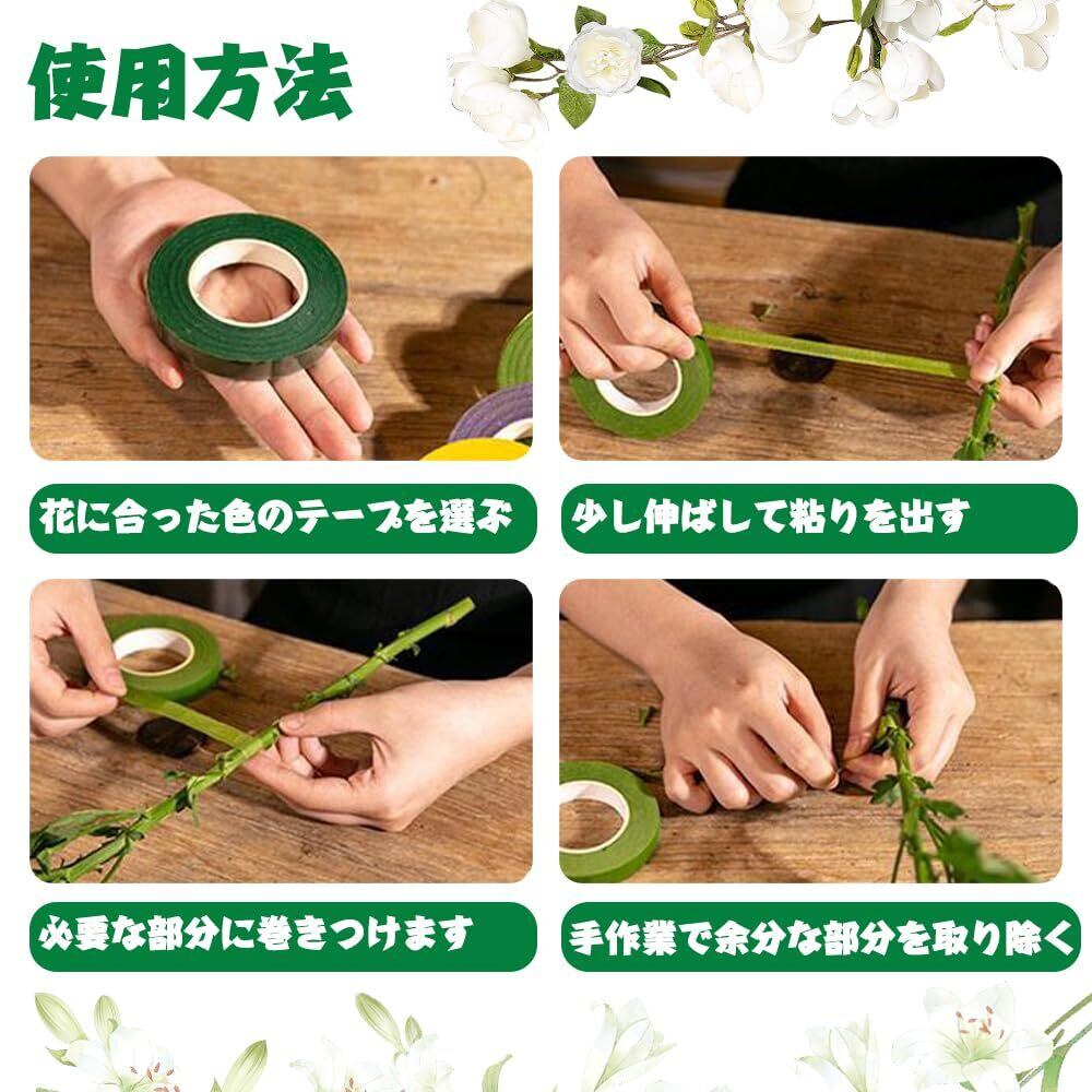 [材質]:フローラテープはクレープ紙を採用し、水ベースの接着剤材を採用しており 伸びがよくて、柔軟性もあります、引き裂きやすく、包みやすく