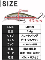 【サイズ/ウェイト】5cm/3.4g スローシンキングタイプ / 渓流ミノーとして扱いやすいサイズと重さです。トレブルフックを標準装備。