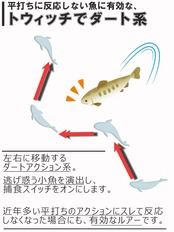 【スローシンキング】サスペンドに近いスローシンキングタイプ。狙った層までミノーを落とし、レンジキープをしながらポイントを通すことを得意とします。やや速めのリトリーブと左右に泳ぐダート系です。
