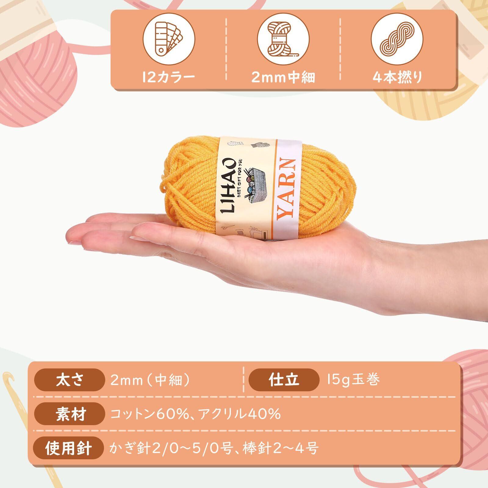 LIHAO 毛糸 中細 12色セット 4本撚り アクリル 糸 1玉15g 約26m 編み物 編み糸 織り糸 ぬいぐるみ用糸