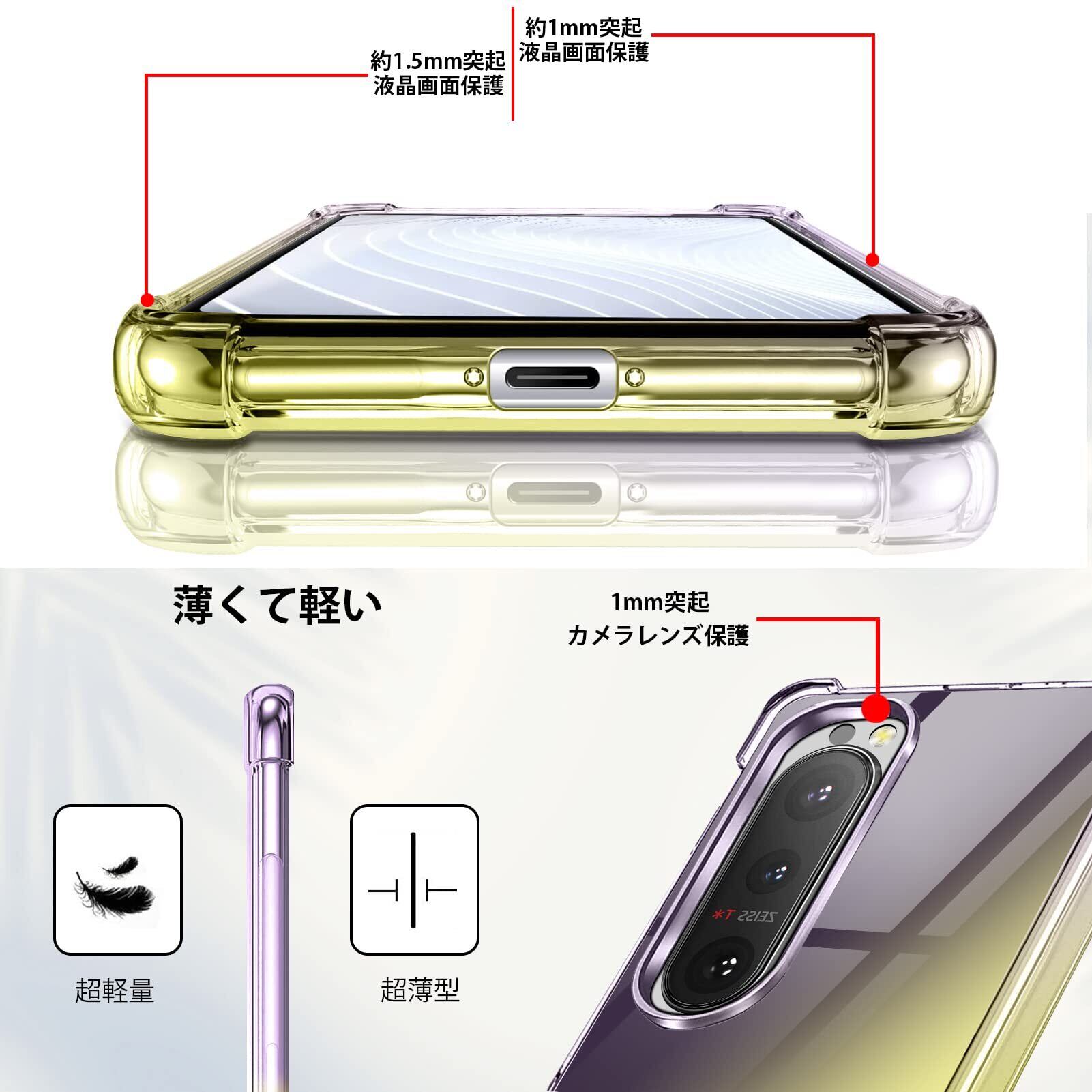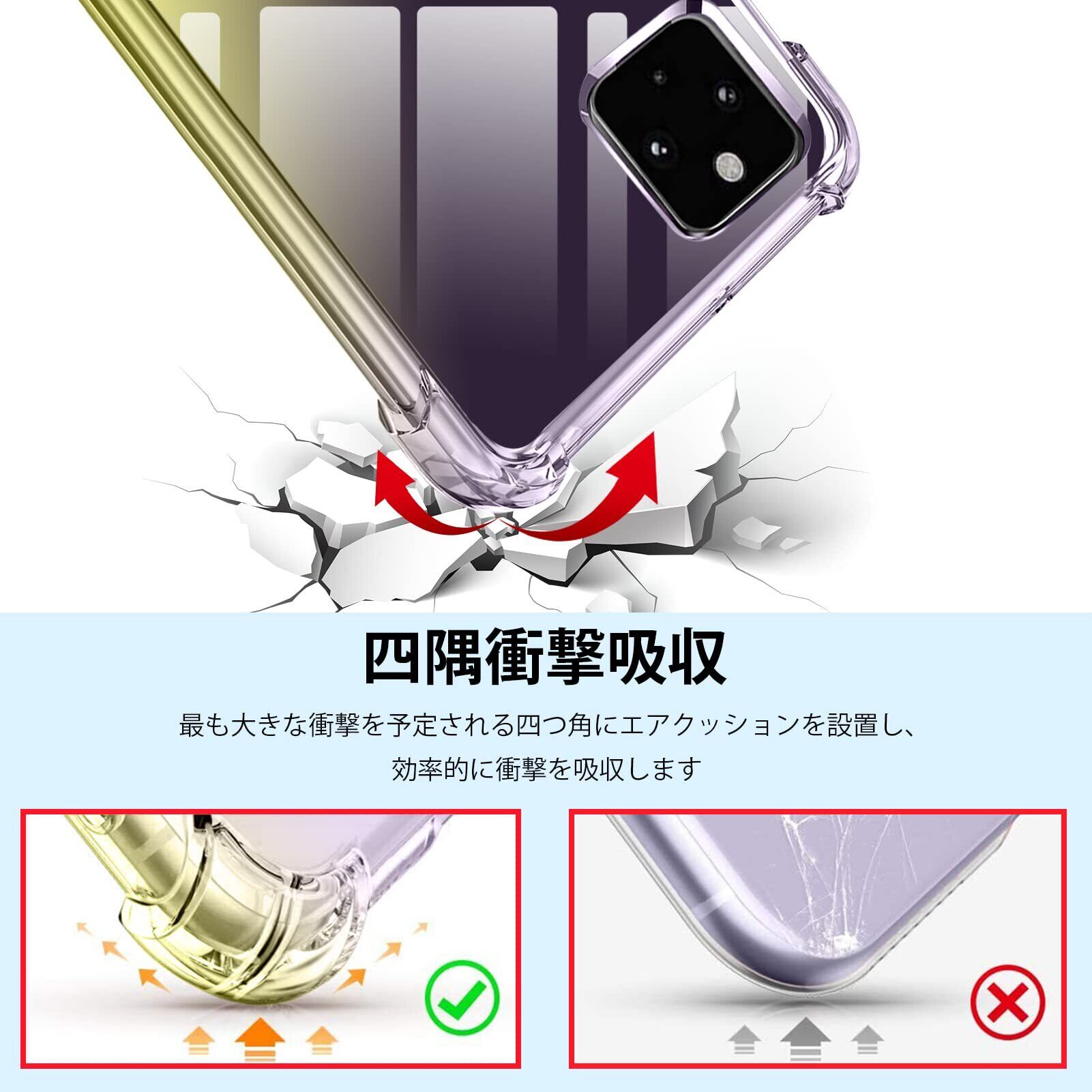 【TPU材質で優れた耐久性】適度な硬さと弾力性をあわせ持つTPUを採用し、衝撃に強く耐久性に優れ、落下や振動、衝突からスマートフォンを保護してくれます。TPUは防水と耐侵食で、水や油分に濡れてもスマホケースへの損傷が有りません。カメラレンズと液晶画面を効果的に保護するために、前面と背面をデバイスより高く設計し、前面と背面を高くすることで携帯を保護し、磨耗や擦り傷を防ぎます。本ケースの角には落下時の衝撃を吸収するエアポケットを備えており、万が一スマホを落としてしまった場合でも、落下時のダメージを最小限に抑えることが可能となっており。
