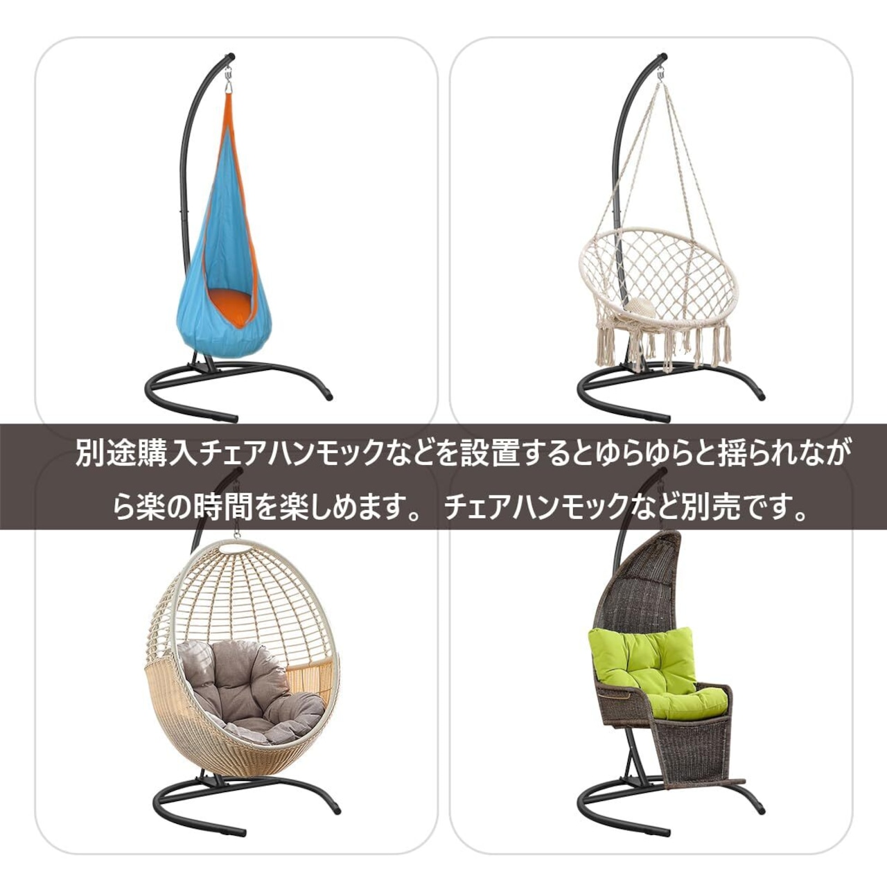 「吊り下げハンモックチェアスタンド」本製品は吊り下げ式ハンモックチェアスタンドと言いてもいいです。というのは、スタンドの頂端部分に別途購入のチェア用生地を取り付けるだけで吊り下げ式ハンモックチェアとしても使用することもいいです。