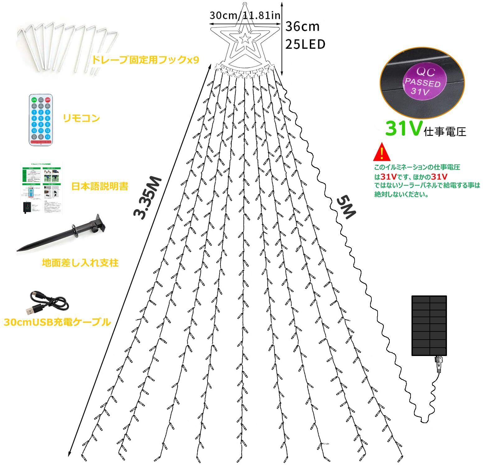 【トップ星クリスマス イルミネーション商品仕様】主な材質:PVC+銅線+ABS 【電源】ソーラーパネル中の充電池(1200mAH) 【点灯パターン】13種類の点灯パタン 【タイマー】3/5/8時間タイマーあり【記憶機能】メモリー機能付き 【充電方法】ソーラーとUSB2種類の充電方法 【制御】リモコン遠隔制御あるいはソーラーパネル後ろのボタン制御 【特徴】光センサー、昼自動消灯充電夜自動点灯;残電量インジケータあり