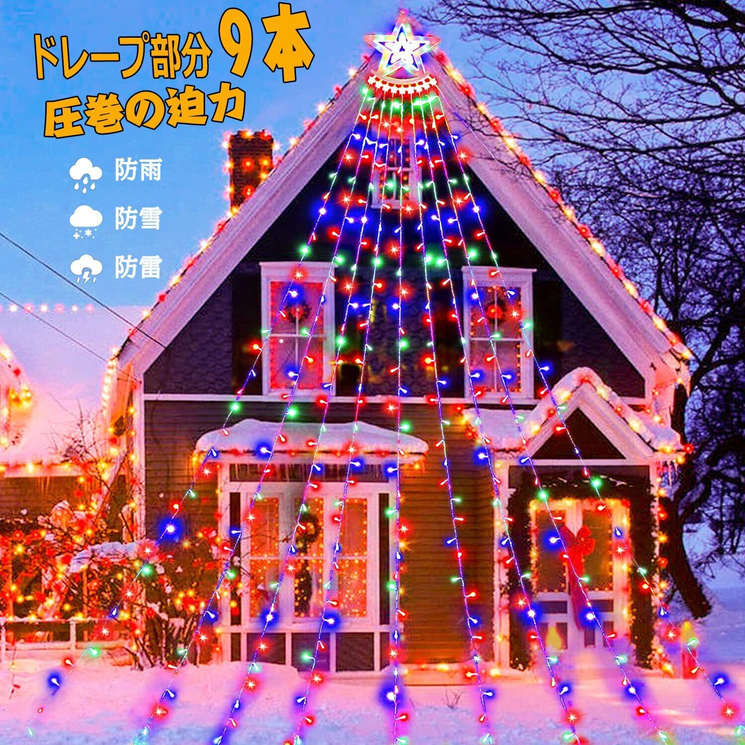 【様々なシーンに大活躍】存在感抜群の大型イルミネーション。ドレープ部分は満足の9本です。ポールを用意してクリスマスツリーの代わりに。または、ベランダや壁面から1階へかけての飾り付けやフェンスへの飾り付けはもちろん、パーティーでの演出など、幅広くご利用できます。もちろん、冬だけのイルミネーションとしてではなく、年間を通したガーデンライトとしてもおすすめです。