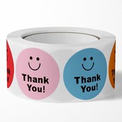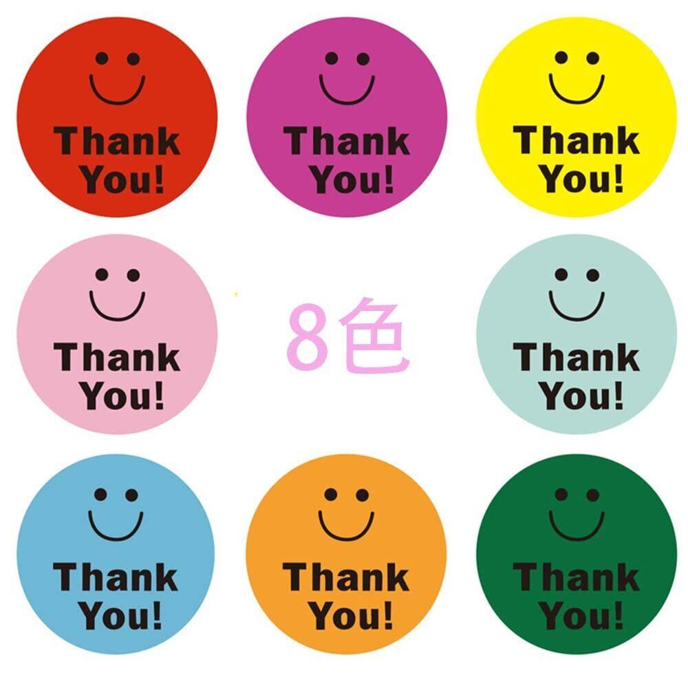 【製品内容】笑顔Thank you シール、8種類色セット:赤、黄、ピンク、緑、オレンジ、水色、青、赤紫、500枚/1ロール。