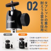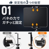 【改良版の雲台&タブレットホルダー】タブレットの重みに耐えうる雲台で安定性UP!角度調整は自由自在、アルミニウム合金製でスムーズかつなめらかな動き。改良版のスマホホルダーはバネの力でしっかり固定!たったのワンアクションでガチっとホールドします。