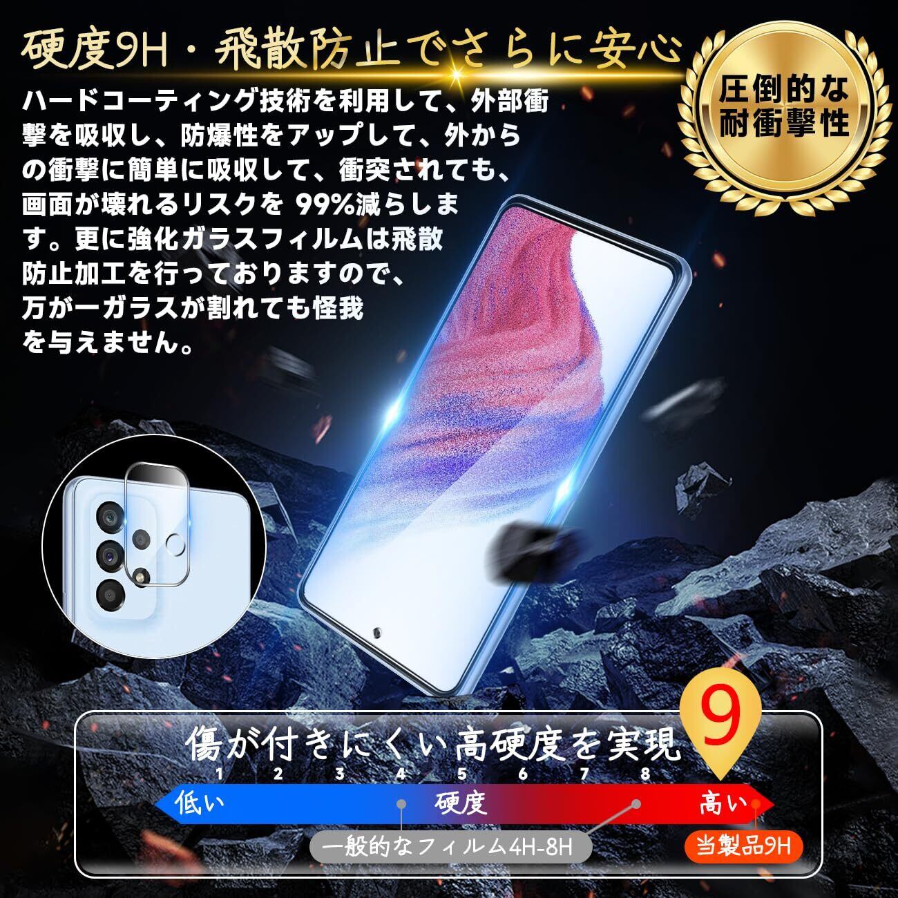 【高品質の材料の9H硬度】とレンズ保護フィルムはすべて旭硝子で作られており、スマホ保護フィルムの中で最高レベルの9H硬度に達しています、4.5時間以上の高温焼入れ処理を行い、スクリーンプロテクターの圧強度は 125mpa に達し、通常 ガラス の 5 倍になりました。しかもスクリーンプロテクターは衝撃を抑えるシリコンコーティングを内蔵しており、万が一ガラスが割れても、ガラスの破片が飛散しません。ハードコーティング技術は、衝撃を最小限に抑えて画面の破損を抑え、すり傷防止や指紋防止もしっかりとスクリーンを保護します。*大切な携帯電話の液晶画面を保護し、衝撃や表面のキズを防止します。