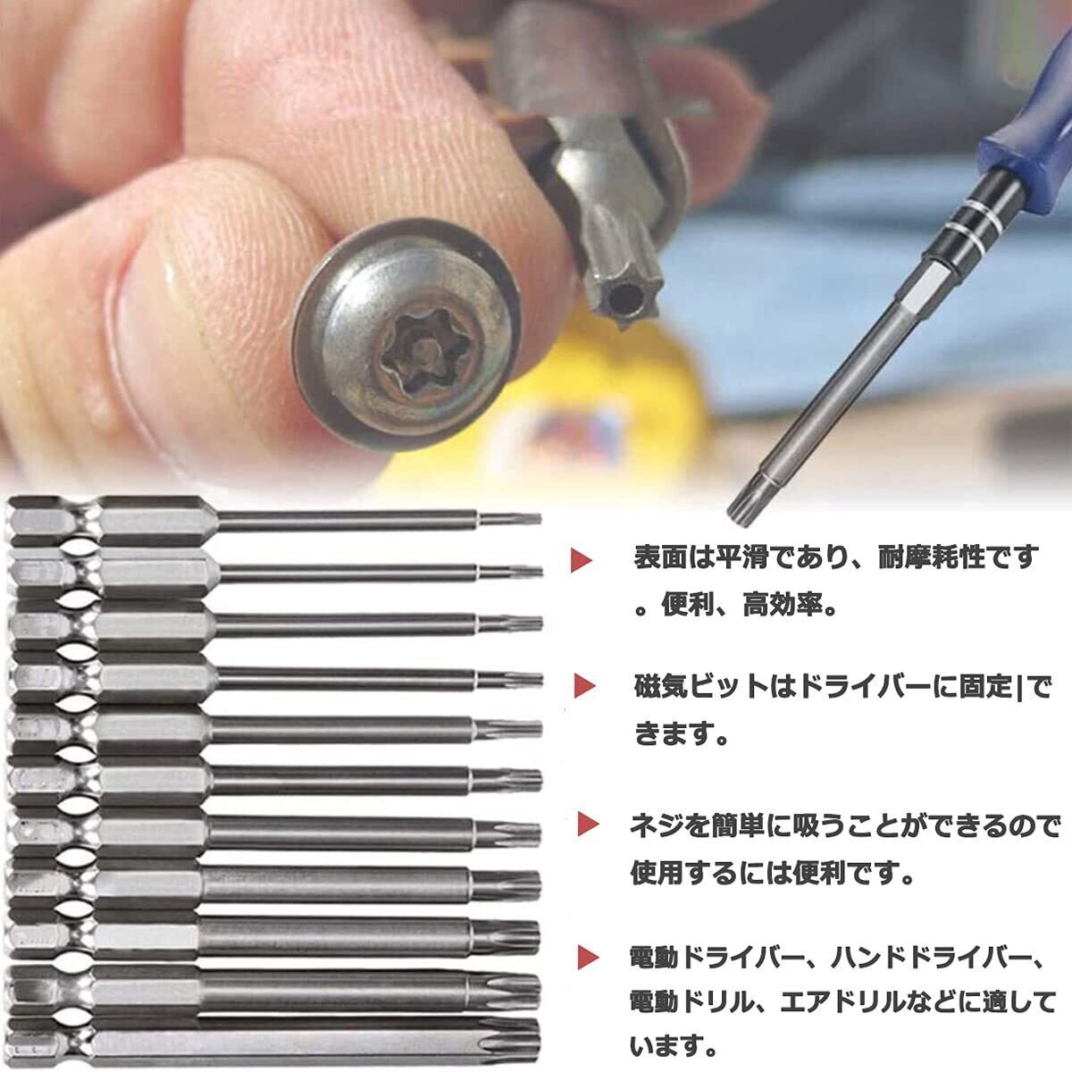 トルクスドライバー ビット 11本セット 中空トルクス頭 75mm 六角軸 6.35mm T6-T40 S2鋼ドライバービット 磁気 トルクス星ネジ用ビットセット 六角ビット ドリル ビット工具