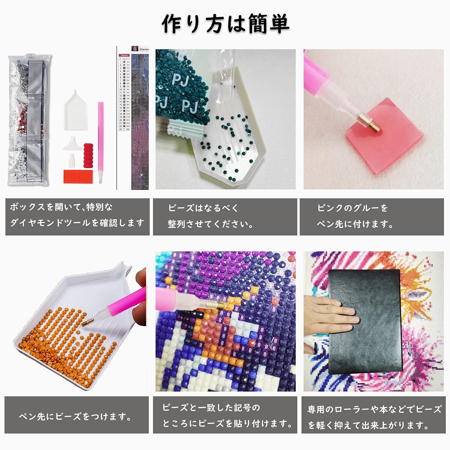 【作り方は簡単】ペン先をピンクのグルーを付けて台紙にビーズと同じ記号または英数字を貼り付けるだけでキラキラなダイヤモンドアートが仕上がります。クロスステッチ刺しゅうより気軽になり、集中力がUP、達成感もじゅうぶん味わっていただけます。