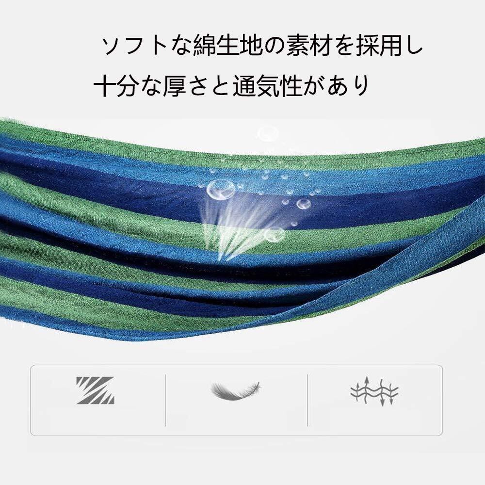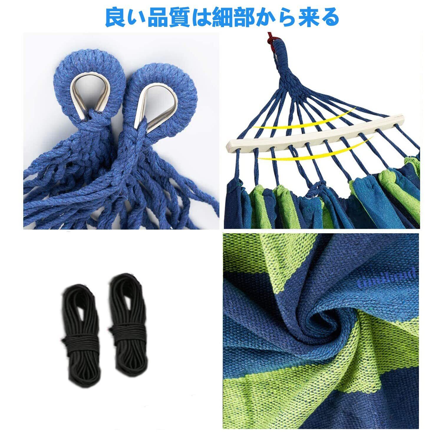 【ハンモック・安心の素材】ブルー系 ソフトな綿生地の素材を採用し、十分な厚さと通気性があり、丈夫で破れにくい、ベッド部分の生地は寝転ぶのに十分な厚さと通気性があり、ロープは中太の紐を何本も;まとめて太くしていますので、体重を十分に支えられ問題なく利用できると思います。 (耐荷重内での利用に限ります)耐荷重はなんと300キロであります。キャンプ時に快適な寝心地が得られます;