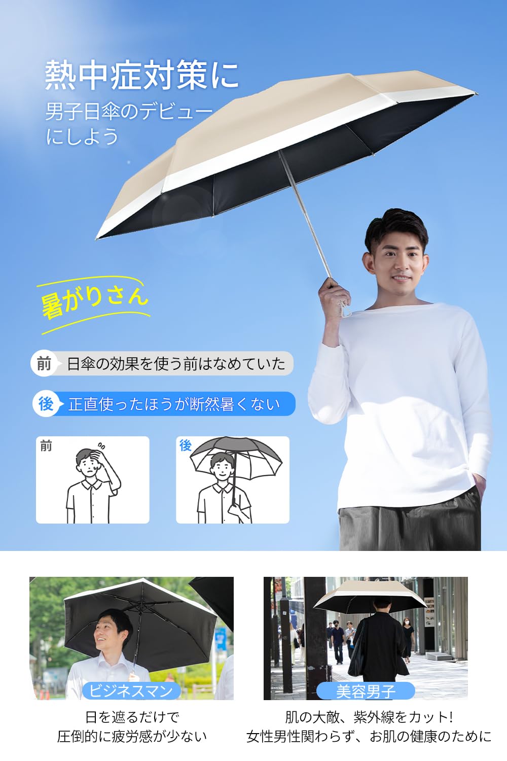 【UPF50+完全遮光折畳み日傘】高密度生地に多層コーティングを施しており、99.99%以上遮光・99.9%以上UVカットの日傘です。炎天下でも強い日差しや紫外線をまったく通さずにカットして日焼け防止。日傘をさすことで太陽光の熱線もカット、直射日光を浴びることによる体表温度の上昇を抑える遮熱効果。厳しい暑さを和らげ、暑い日の通勤通学やアウトドアの際に肌を効果的に守り、暑さ対策・熱中症対策として絶対欠かせないアイテムです。