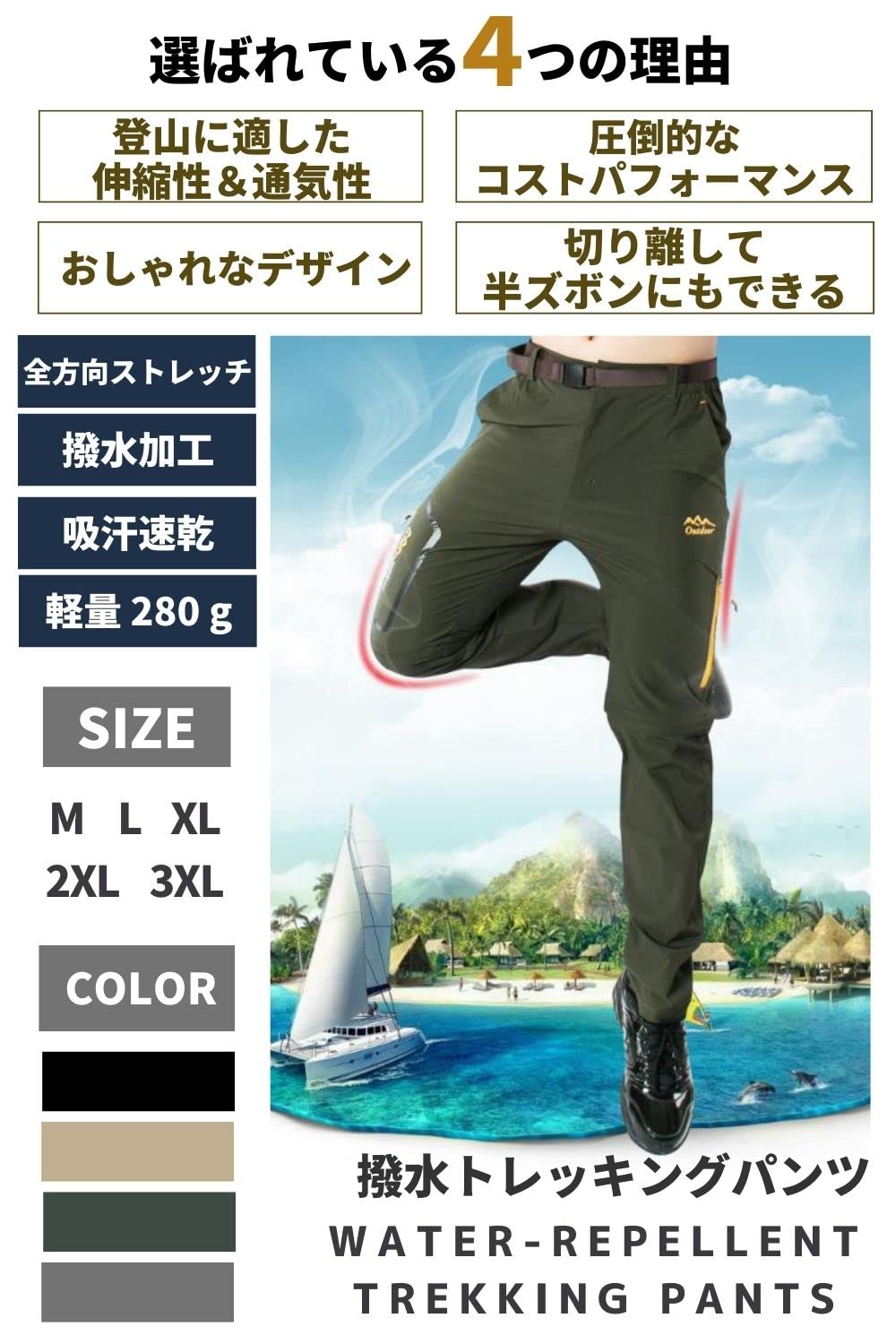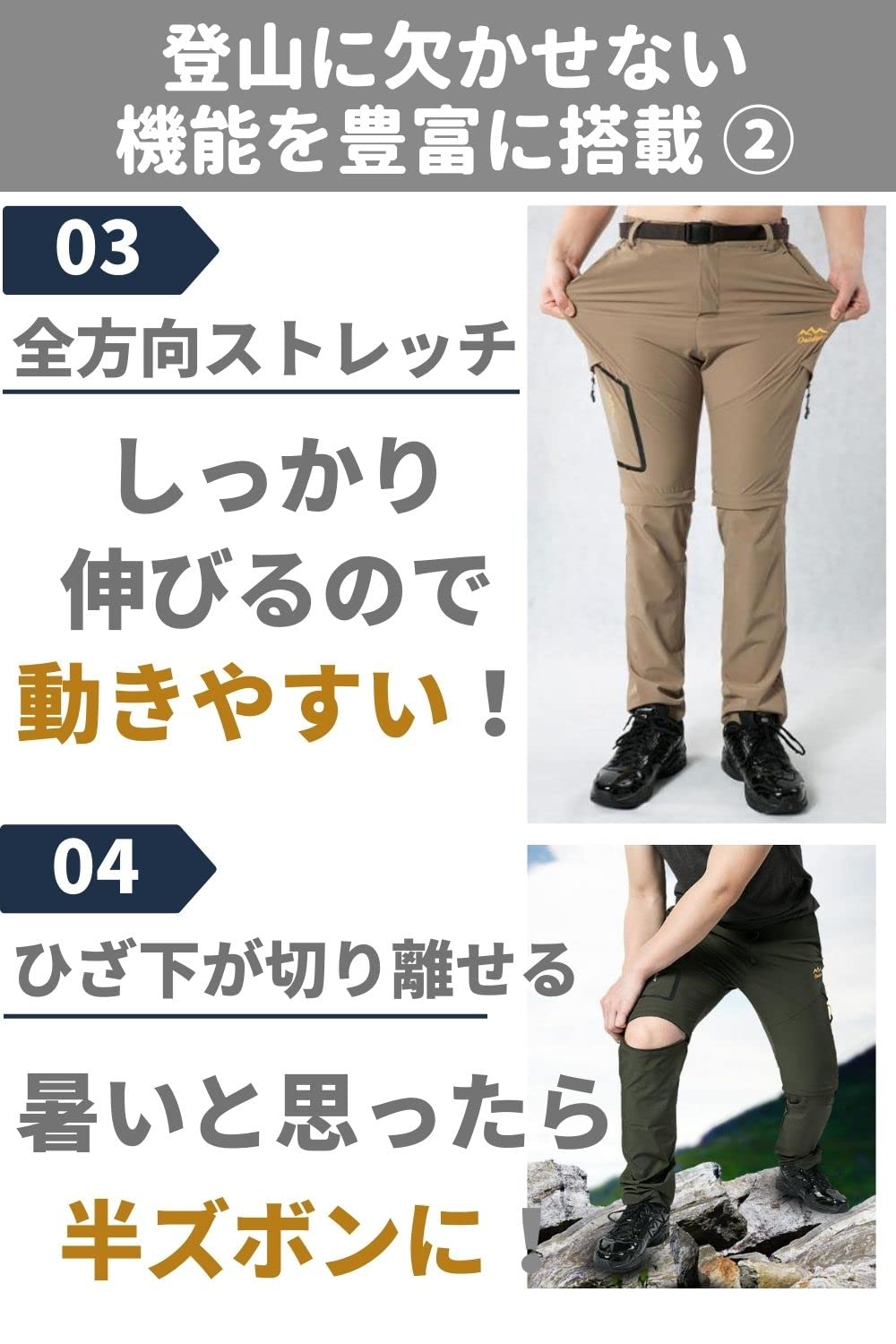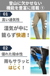 ?【ひざ下が取り外し可能】チャックで簡単に取り外して半ズボンにすることができるので、気候や温度に応じて柔軟に対応できます。気温差が激しい登山ではとても重宝する機能です。?【突然の雨でも安心な撥水性能】耐水圧2,000mmの撥水性能を備えた素材を採用しているため、多少の雨であれば防ぐことができます。さらに速乾性が高いため、すぐに乾きやすいのも利点です。