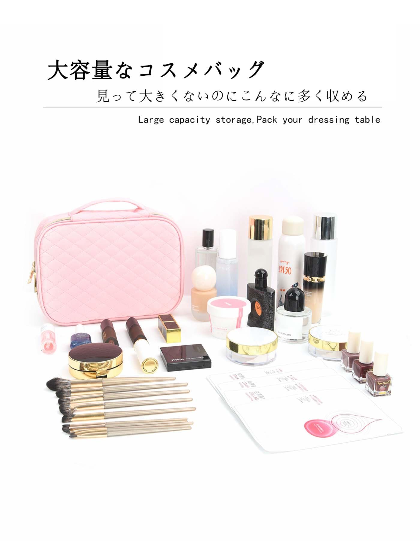 【大容量収納】 小さなサイズにも関わらず、化粧品やスキンケア用品、メイクブラシなどをたっぷり収納できる大容量化粧ポーチ。旅行中や外出先でも安心して必要なアイテムを収納できます。
