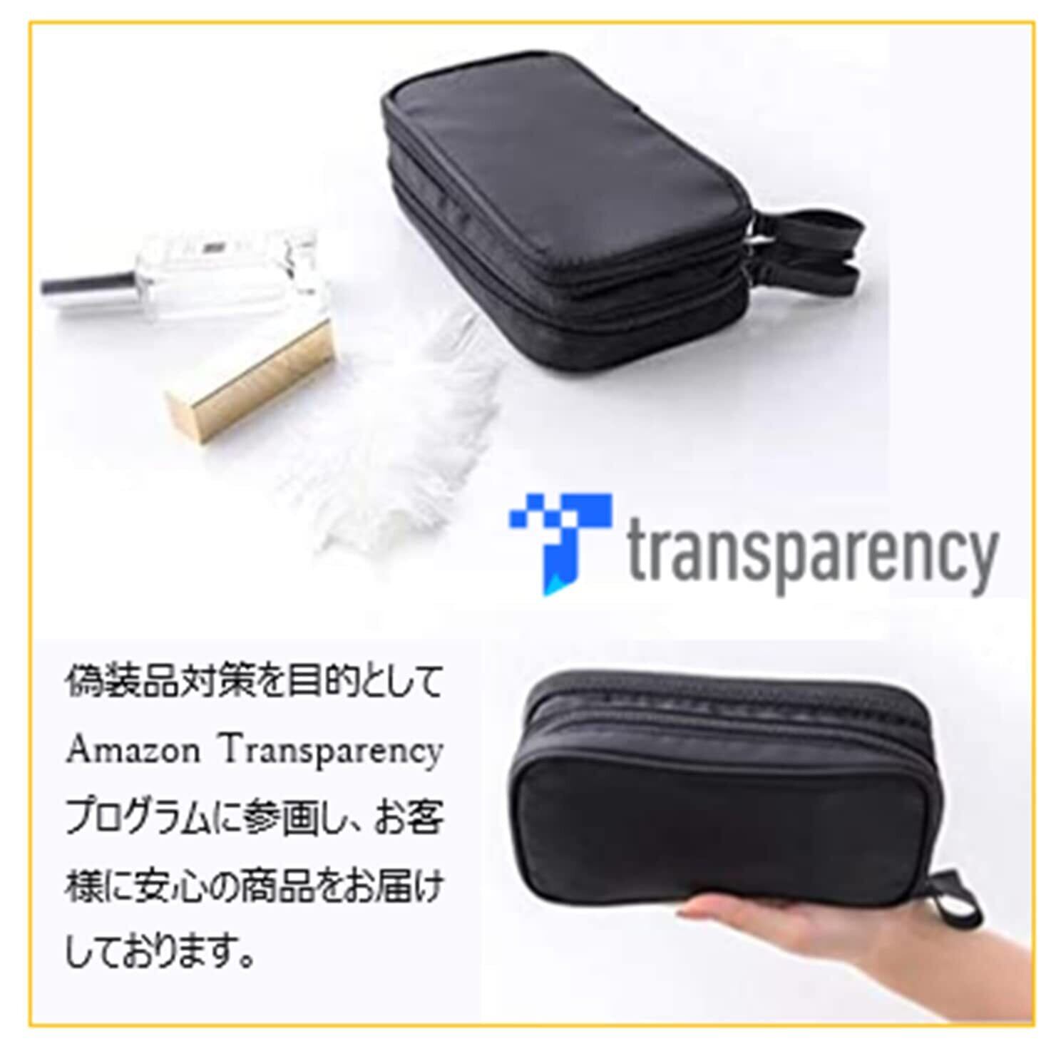 【2層構造の収納層】 各層ファスナーで開閉できるようになっており、片方には、口紅、ファンデーションといったコスメ、化粧品が収納できるような小さいポケットが備え付けられ、もう片方は、化粧ブラシ、マスカラやアイライナーなどのメイク道具が収納できる構造となってます。