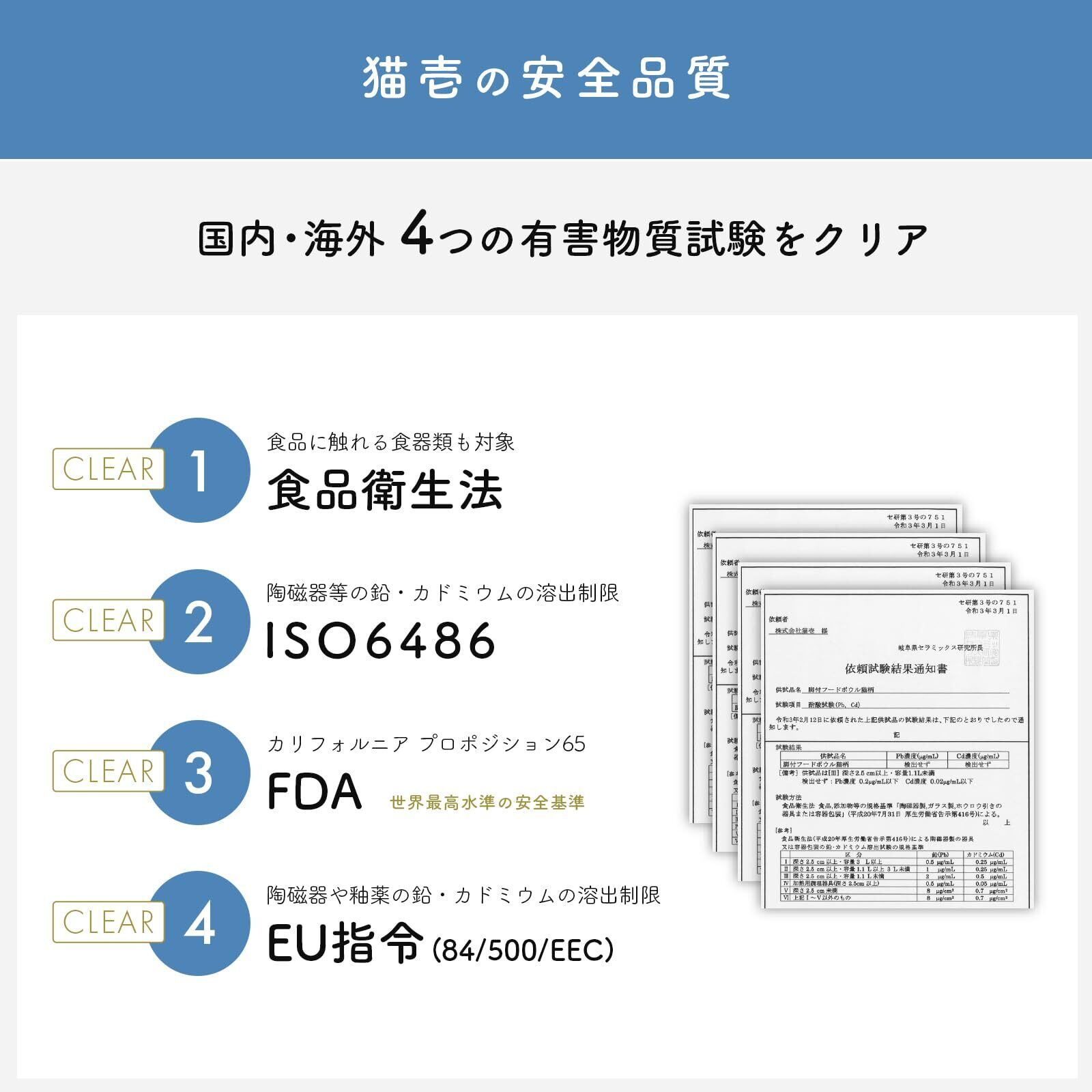 人と同じ安全基準を。「鉛・カドミウムフリー」食器。国内海外4つの有害物質試験をクリアしています。