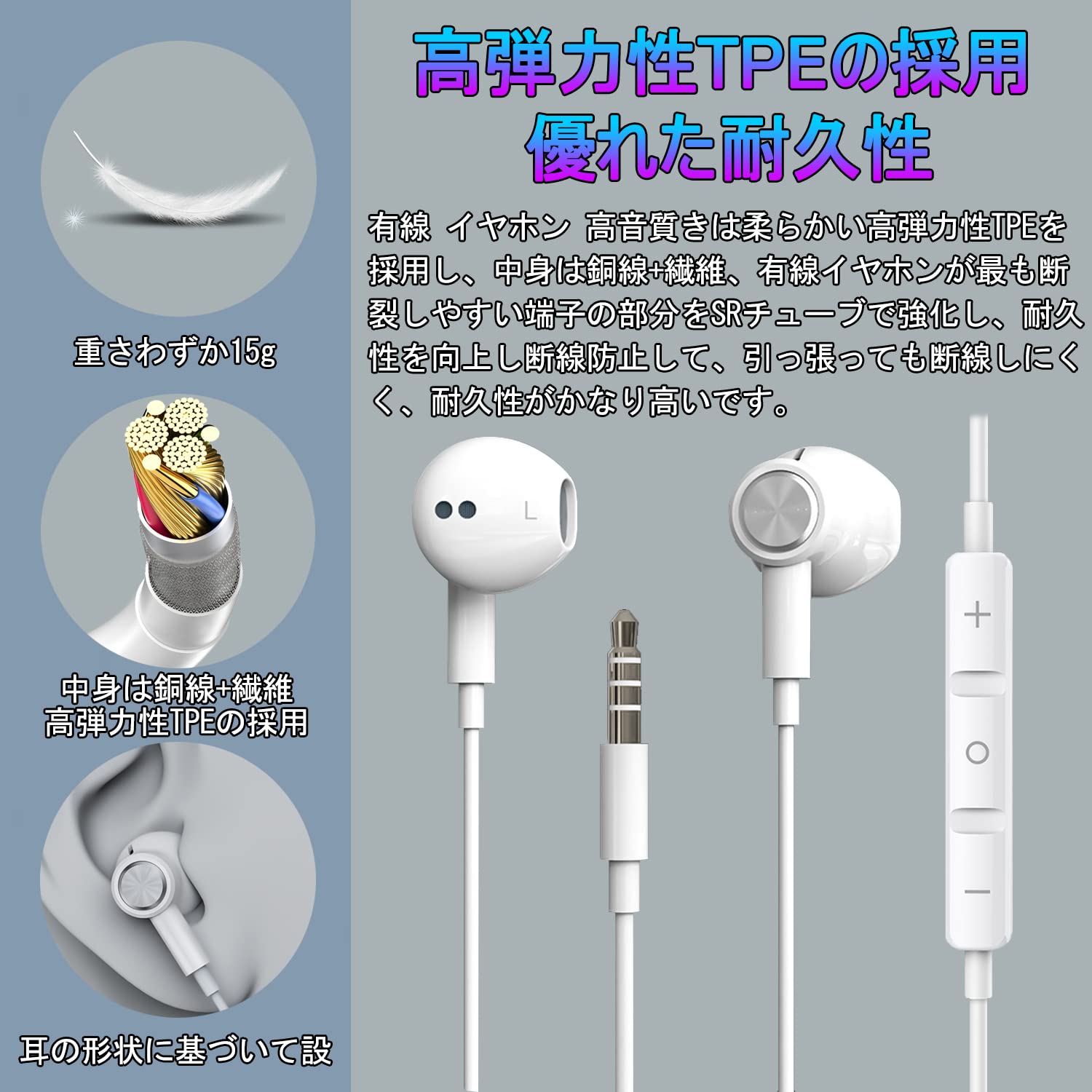 ?【優れた耐久性】有線 イヤホン 高音質きは柔らかい高弾力性TPEを採用し、中身は銅線+繊維、有線イヤホンが最も断裂しやすい端子の部分をSRチューブで強化し、耐久性を向上し断線防止して、引っ張っても断線しにくく、耐久性がかなり高いです。厳しい折り曲げテストを受けてあるので、お安心にご使用できます。また、1年間の品質と30日以内に無条件返品のサービスを提供しておりますので、安心してご購入ください。