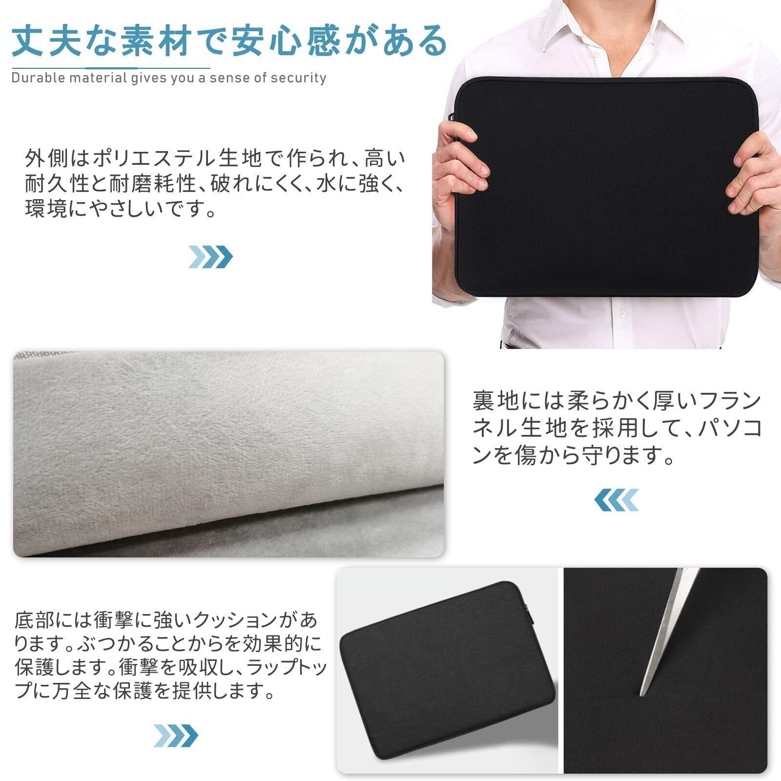 【丈夫な素材で安心感がある】外側はポリエステル生地で作られ、高い耐久性と耐磨耗性、破れにくく、水に強く、環境にやさしいです。裏地には柔らかく厚いフランネル生地を採用して、パソコンを傷から守ります。底部には衝撃に強いクッションがあります。ぶつかることからを効果的に保護します。衝撃を吸収し、ラップトップに万全な保護を提供します。