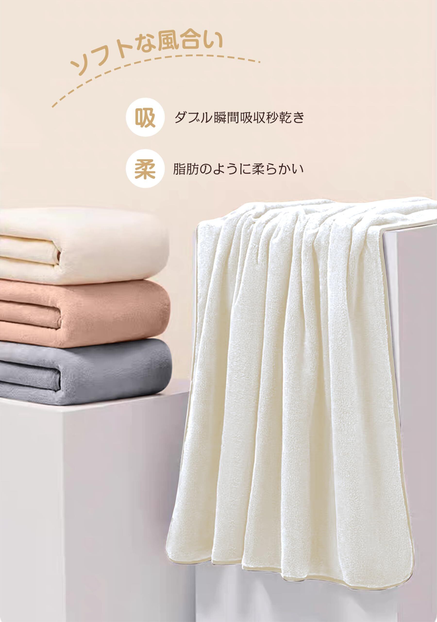 【ふわふわ】高級マイクロファイバー素材を採用 - このバスタオルは髪の毛の1/100のサイズのマイクロファイバー(極細繊維)で作られています。 毛細管現象で水分を素早く吸収・拡散します。 拭かずに触るとツルツルになります。 蛍光染料不使用でソフトな肌触りで優しい仕上がりです。 品質: このバスタオルは色褪せないや毛羽落ちしないことをします。