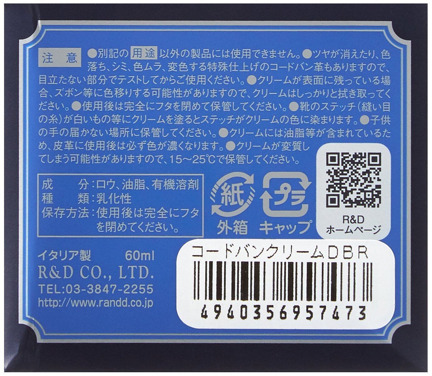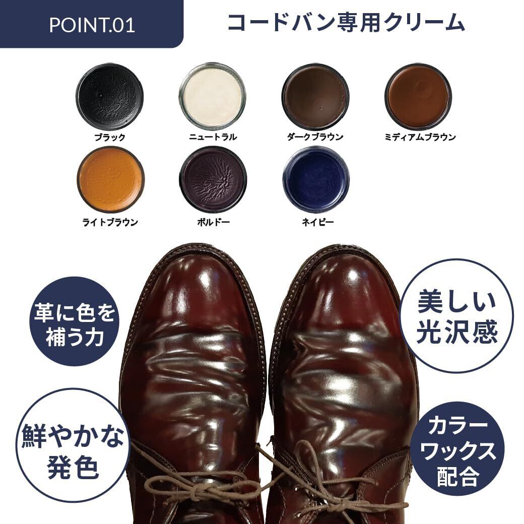 ・特殊なカラーワックス配合によりコードヴァンの色を鮮やかに蘇らせて補色します。・保革(栄養)効果や美しい光沢感を出すことでコードヴァンが本来放つツヤをしっかりと出します。着色力が強く革に色がうまく乗るので、ガラスレザー等の通常の乳化性クリームが浸透しにくい革の補色にもお使い頂けます。■用途:コードヴァン(コードバン)の補色・栄養・ツヤ出し、ガラスレザーの補色・ツヤ出し■タイプ:乳化性クリーム ガラスビン入り■容量:60ml ■原産国:イタリア製 ■カラー:全7色(ブラック・ニュートラル・Mブラウン・Dブラウン・Lブラウン・ネイビー・バーガンディ)■注意:用途以外の製品には使用できません。必ず目立たない部分でテストしてからご使用下さい。