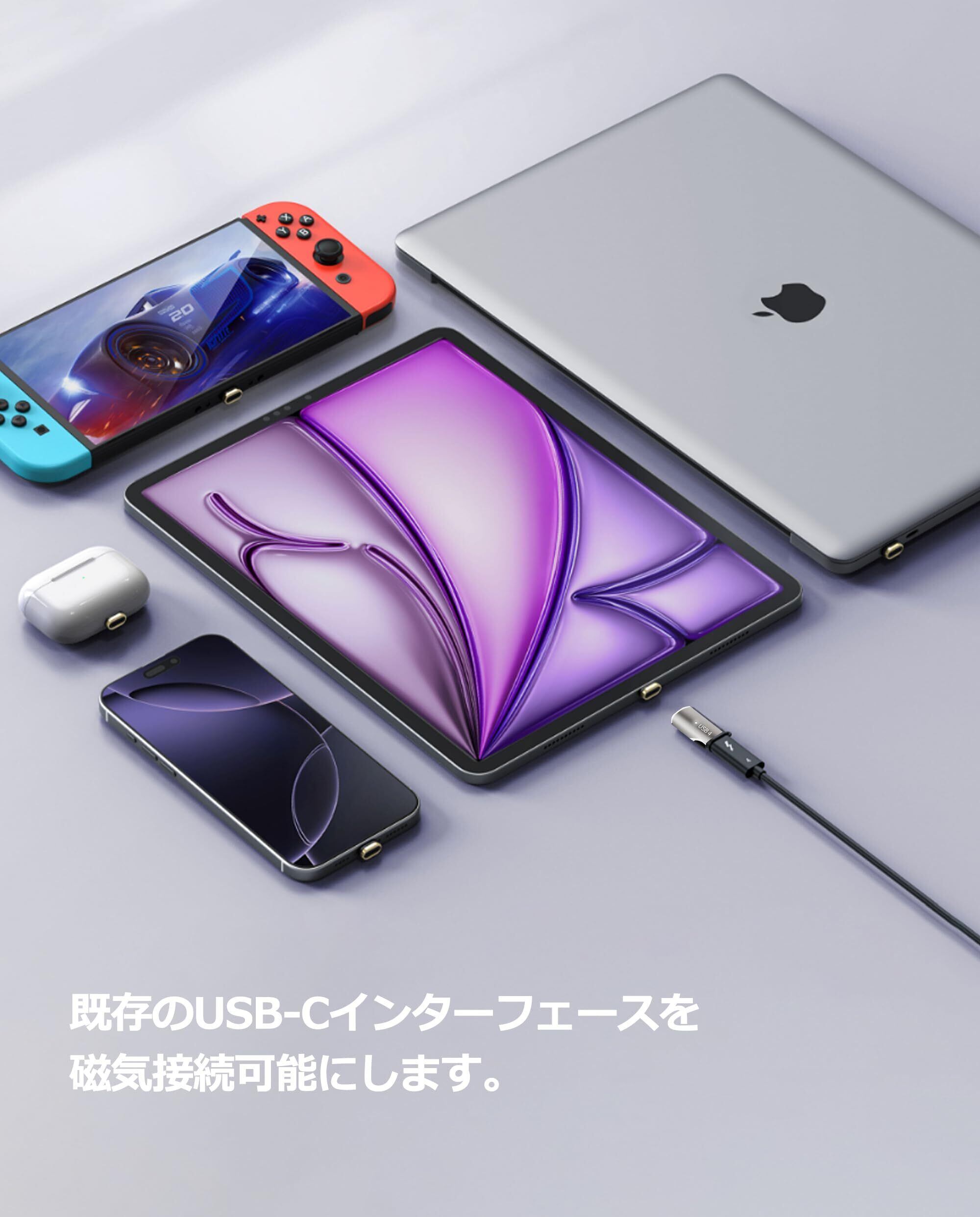 USB-Cケーブルが瞬時にマグネット式に:マグネット設計、近づけるだけで瞬時に接続、軽く引くだけで簡単に外れる。誤ってケーブルを引っかけても、デバイスが落下する心配な。
