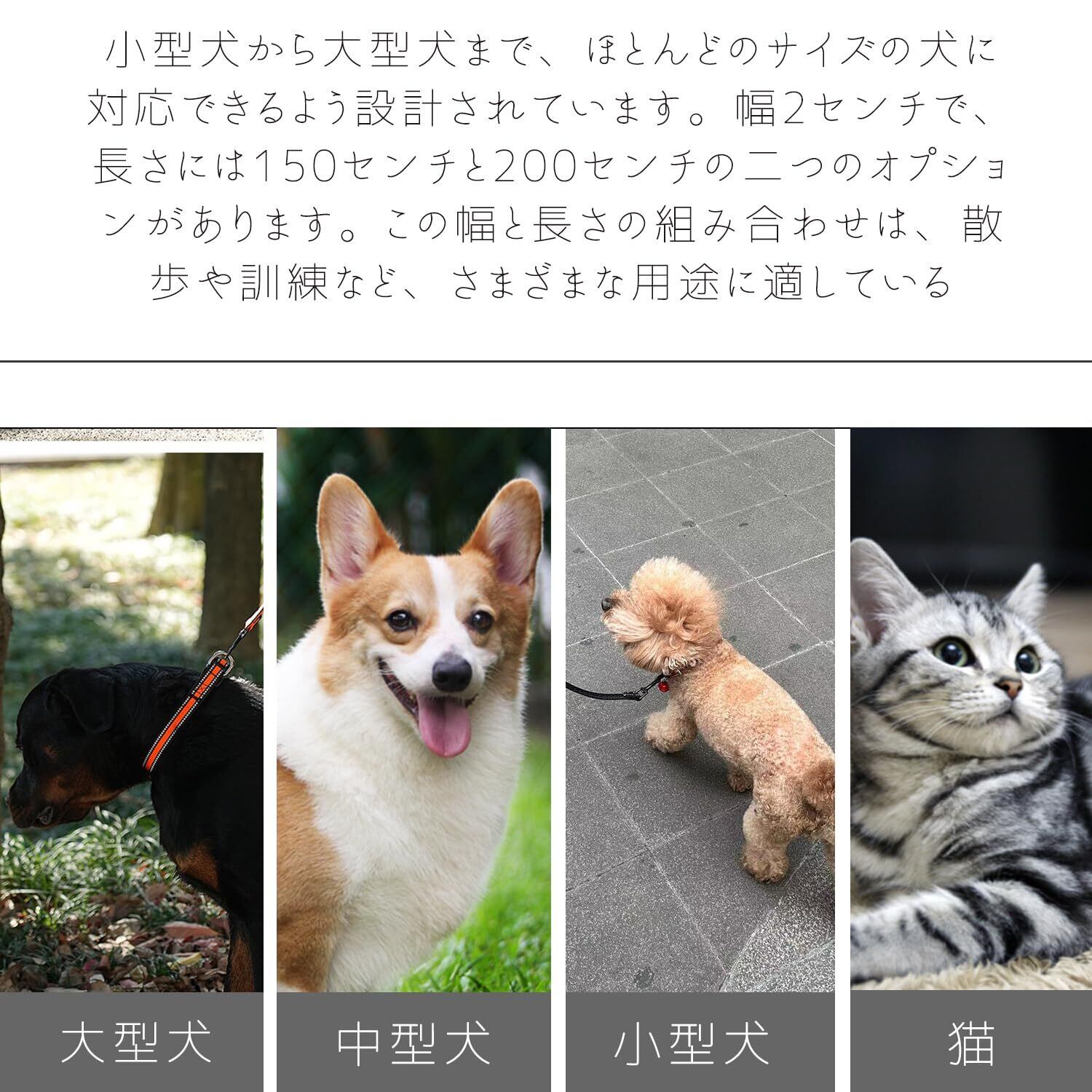 夜間の安全性: リードには3M反射ステッチが施されており、暗い夜道でも安全に散歩できるよう設計されています。この反射材料は光を反射し、夜間の視認性を高めます